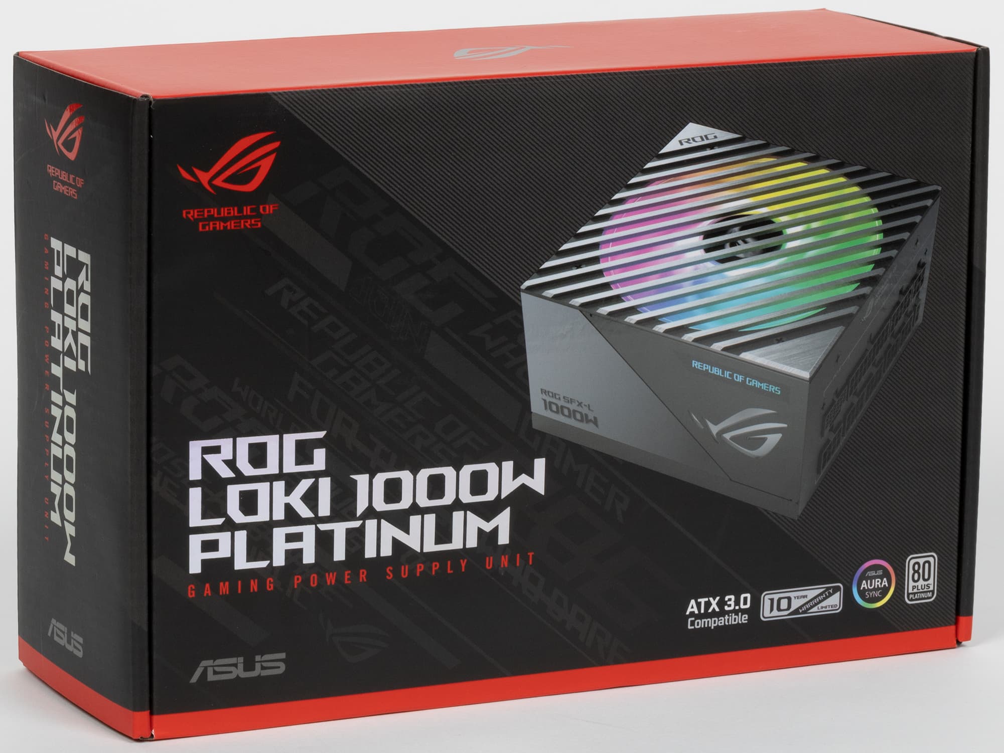Поставляется блок питания в коробке из картона, дизайн которой оформлен в фирменных цветах Republic of Gamers (ROG): черном и красном.