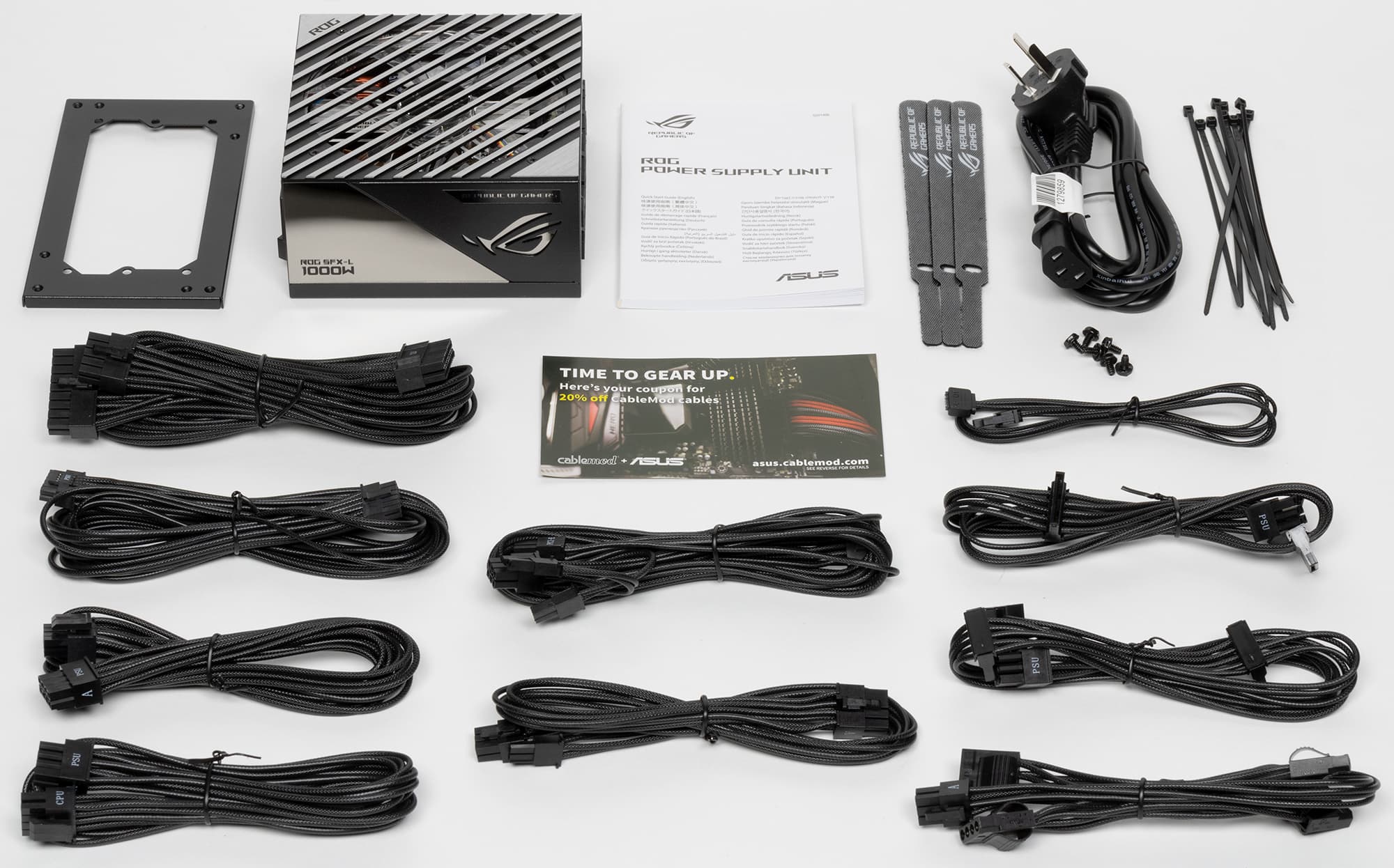 Блок питания Asus ROG Loki SFX-L 1000W Platinum имеет сертификат 80+ Platinum. Выполнен он в довольно специфическом формате SFX-L, который представляет собой увеличенный до 125 мм в длину стандартный SFX. Подобные решения не намного компактнее стандартных моделей формата ATX и используются, как правило, в корпусах, которые изначально предназначены именно для БП формата SFX-L или же в которых имеется посадочное место для стандартного БП формата ATX, но расстояние от блока питания до разъемов системной платы небольшое, что позволяет устанавливать подобные решения при помощи переходника. Надо отметить, что в комплекте поставки данной модели такой переходник есть: это стальная рамка с 8 отверстиями. Так что при желании Asus ROG Loki SFX-L 1000W Platinum можно штатно использовать в компактных корпусах вместо БП формата ATX — это позволит сэкономить немного места, которого в таких корпусах обычно немного.