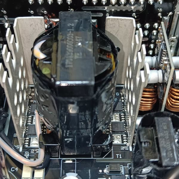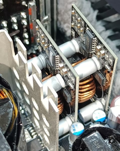 Конструкция блока питания вполне соответствует современным тенденциям: активный корректор коэффициента мощности, синхронный выпрямитель для канала +12VDC, независимые импульсные преобразователи постоянного тока для линий +3.3VDC и +5VDC.