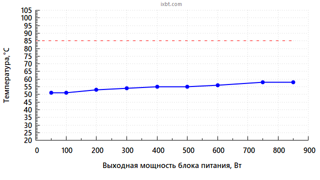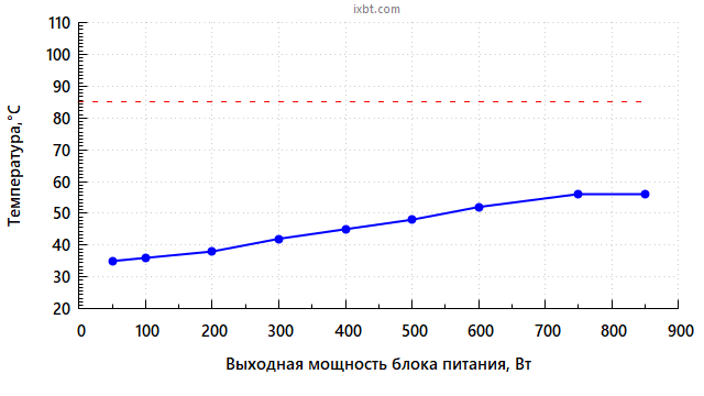 Также стоит учитывать, что в случае работы с остановленным вентилятором температура компонентов внутри БП сильно зависит от окружающей температуры воздуха, и если та установится на уровне 40-45 °C, это приведет к более раннему включению вентилятора.
