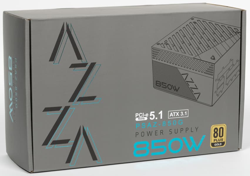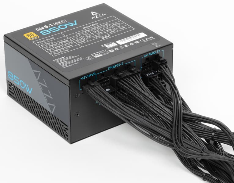 В этот раз мы познакомимся с блоком питания Azza PSAZ-850G Fully modular, который имеет сертификат 80+ Gold, соответствует стандарту ATX 3.1 и позволяет питать очень мощные современные видеокарты через 16-контактный разъем PCIe 5.1 (12V-2×6). В данной серии существуют также модели мощностью 750 и 1000 Вт. Существует и вариант данного блока питания с фиксированными проводами.