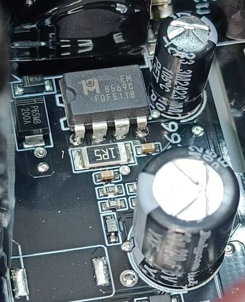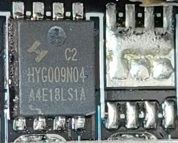 Синхронный выпрямитель собран на четырех транзисторах HYG009N04, которые установлены с лицевой стороны основной печатной платы, на них нет радиаторов, но вокруг места установки есть теплорассеивающие элементы.