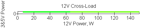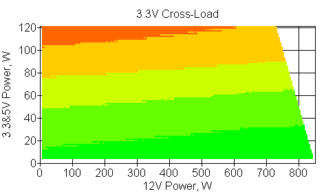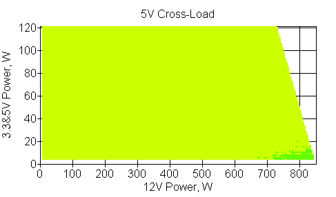Следующим этапом инструментального тестирования является построение кросснагрузочной характеристики (КНХ) и представление ее на четвертьплоскости, ограниченной максимальной мощностью по шине 3,3&5 В с одной стороны (по оси ординат) и максимальной мощностью по шине 12 В с другой (по оси абсцисс). В каждой точке измеренное значение напряжения обозначается цветовым маркером в зависимости от отклонения от номинального значения.