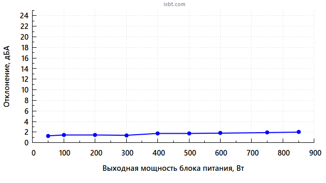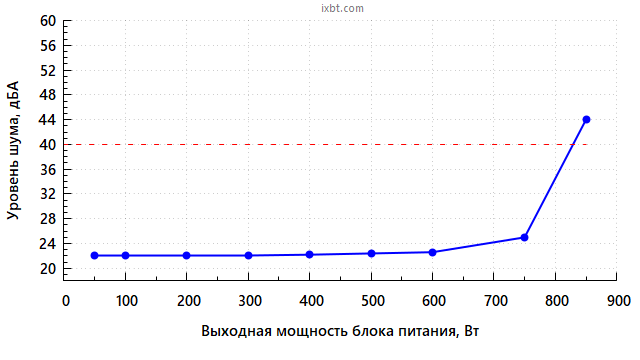 В диапазоне мощности до 750 Вт включительно шум блока питания находится на минимально заметном уровне для жилого помещения в дневное время суток (25 дБА и менее).