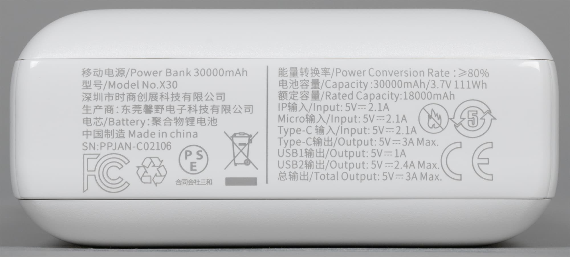 Вновь приходится объяснять: ампер-час очень коварная единица, использование которой легко может ввести в заблуждение, если не учитываются еще и напряжения — для литий-ионного аккумулятора это 3,7 вольт, а для выходов пауэрбанка 5 вольт и более, если поддерживаются разные режимы PD и/или QC. Лучше пользоваться значениями энергии, для батареи в данном случае мы имеем 111 Вт·ч (30000 мА·ч умножить на 3,7 В), а если интересны «приведенные к выходу» миллиампер-часы, то делим эти ватт-часы на 5 вольт и получаем 22200 мА·ч, то есть уже заметно меньше. Да еще и преобразование напряжения не происходит без потерь — надо учитывать КПД, который всегда меньше единицы, но не всегда указывается в спецификации.