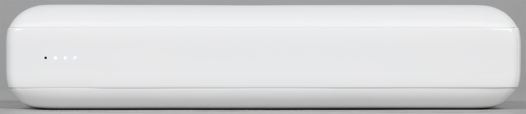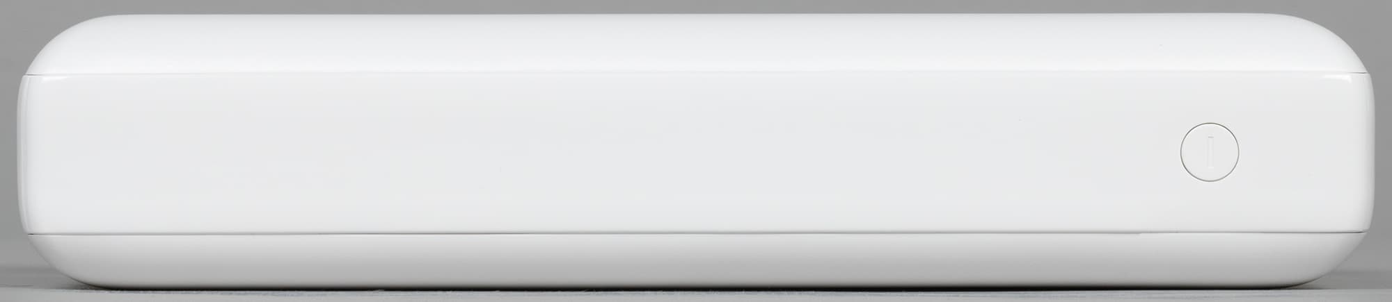 Устройство предлагается в двух расцветках: черной и белой; материал корпуса — пластик, крышки матовые, а соединяющая их средняя часть зачем-то сделана глянцевой. Белый пауэрбанк (нам достался именно такой) выглядит элегантнее, но вряд ли при реальной эксплуатации это впечатление сохранится надолго; если бы у нас был выбор, мы остановились бы на черном варианте.