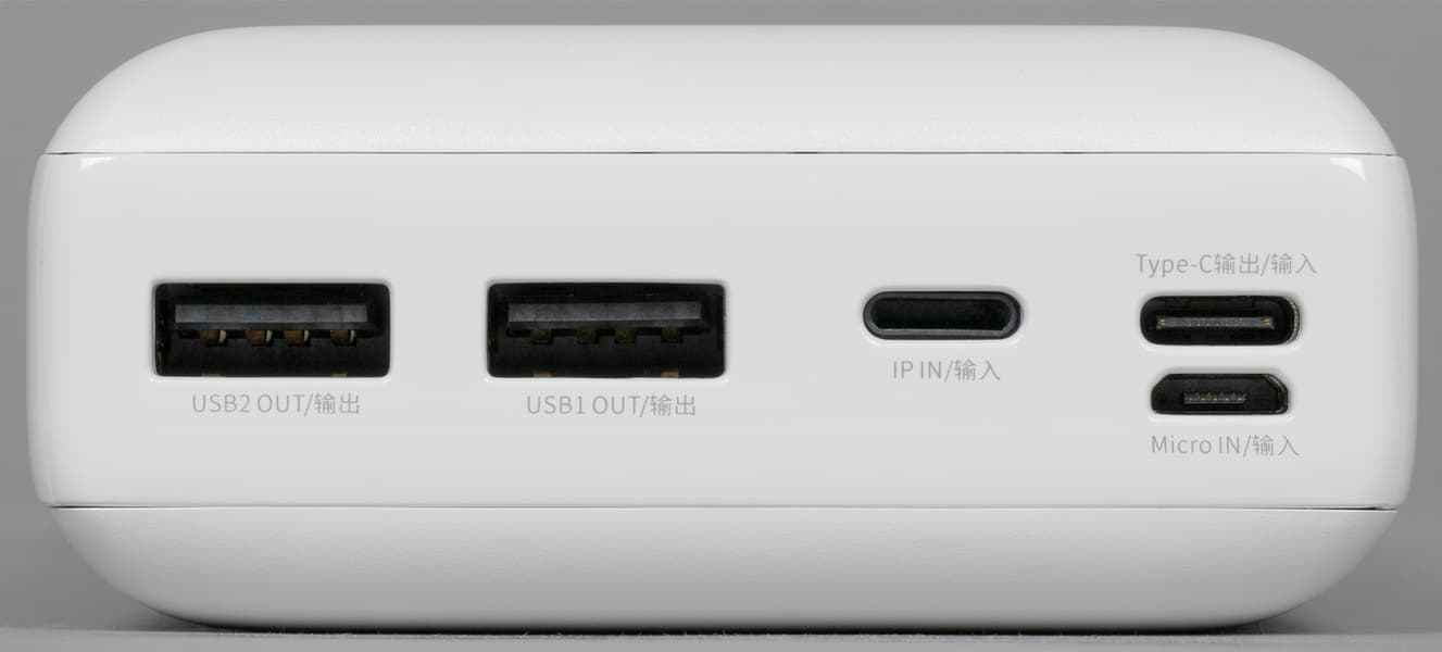 Набор разъемов такой: два выхода USB-A, вход под коннектор lightning, вход Micro-USB, а также Type-C, который может быть и входом, и выходом.