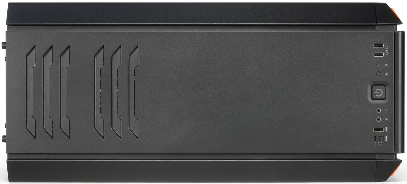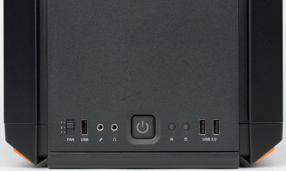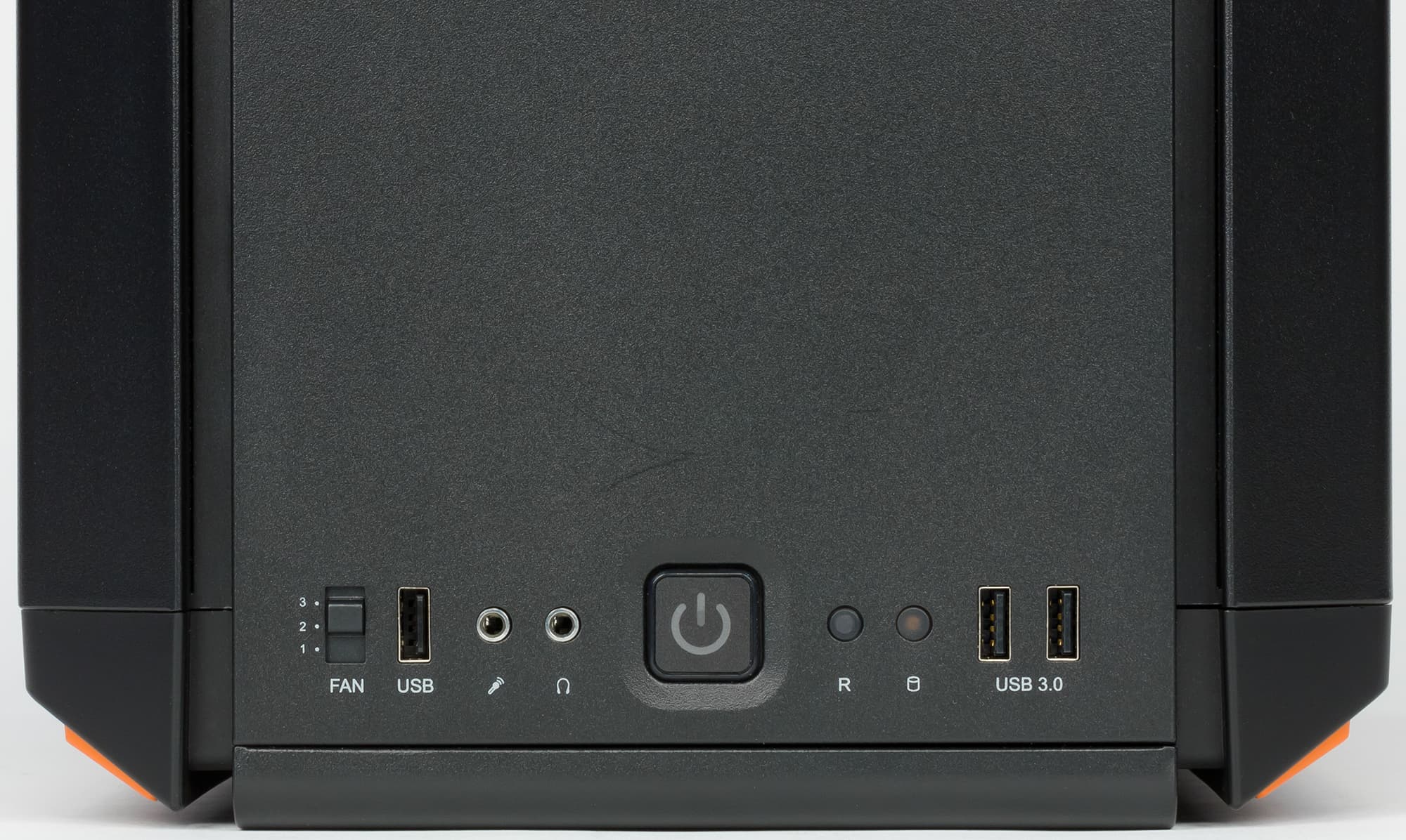 В передней части верхней панели имеется блок с органами управления и коммутации. В его состав входят: переключатель режимов работы вентиляторов, два порта USB 3.0, один USB 2.0, стандартные разъемы для подключения микрофона и наушников, круглая кнопка включения с минимальным рабочим ходом и кнопка перезагрузки. Индикатор включения встроен в «свою» кнопку. Кнопка перезагрузки имеет минимальные размеры, но нажать на нее пальцем вполне реально, так как для срабатывания не требуется утапливать ее глубоко.