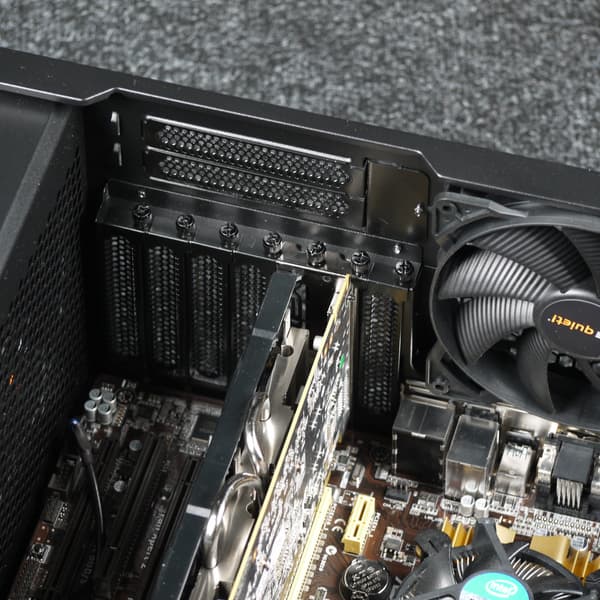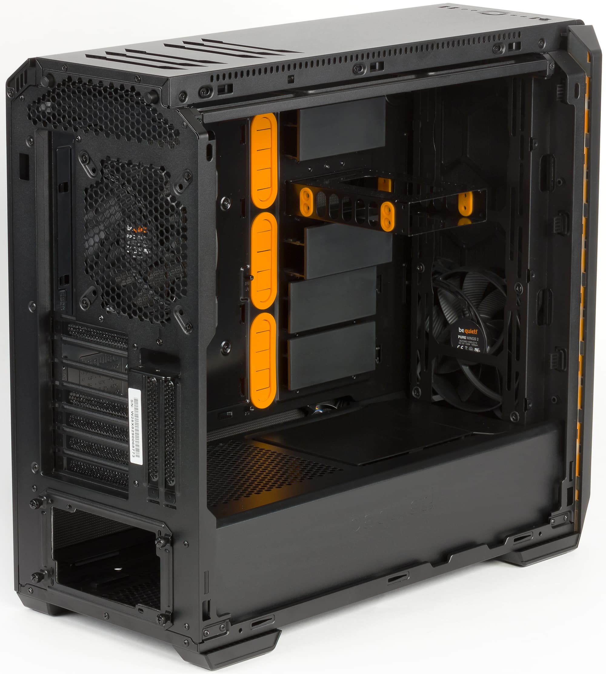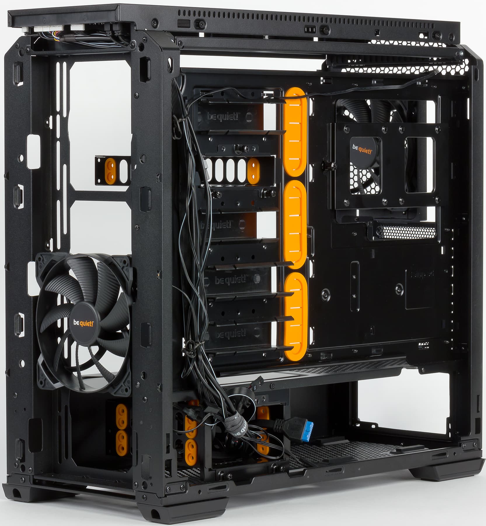 В монтажных отверстиях установлены лепестковые мембраны, а также фирменные заглушки be quiet! под названием HDD Slot cover, располагающиеся между системной платой и передней стенкой. Заглушки могут находиться в трех положениях: полностью закрыто, частично открыто и полностью открыто. В последних двух положениях через них можно протягивать провода и кабели различного диаметра, что иногда позволяет добиться более аккуратного вида, чем при использовании отверстий с лепестковыми мембранами.