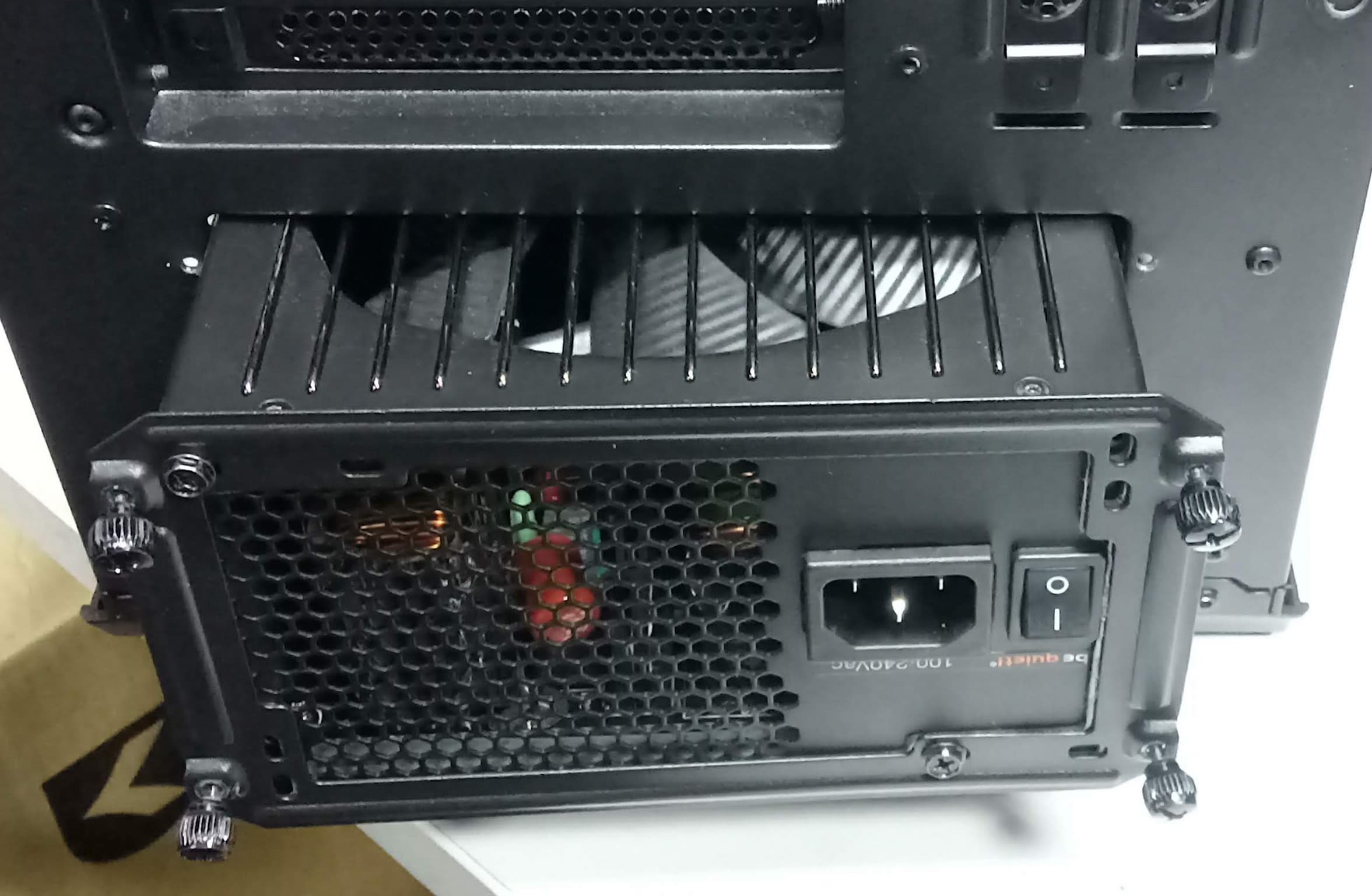 Для установки блока питания необходимо в первую очередь демонтировать стальную рамку с задней стенки корпуса. Блок питания прикручивается к рамке четырьмя винтами, заводится в корпус, после чего рамка прикручивается обратно с помощью четырех винтов с накатной головкой. Возможность двухсторонней установки БП обеспечивается переворотом рамки на 180 градусов. Для размещения невостребованных или излишне длинных проводов есть место в нижней части корпуса, но остается его там не очень много, особенно если БП увеличенной длины.