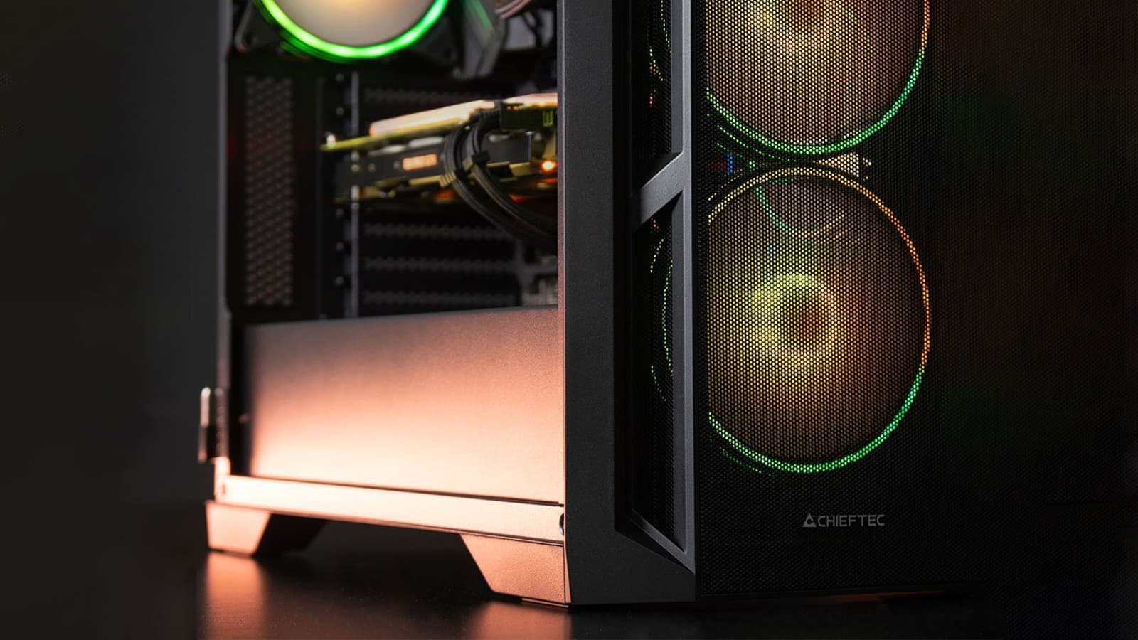 Корпус Chieftec Apex Lumo в достаточной мере универсален — он допускает установку системных плат размером вплоть до E-ATX (разве что без поддержки Back Connect) и широкого спектра прочих комплектующих: ограничения на длину блоков питания и видеокарт скорее теоретические, к тому же предусмотрены разные варианты их установки — горизонтальная или вертикальная для видеокарт, вентилятором вверх или вниз для БП. При этом цену корпуса чрезмерно высокой не назовешь, особенно с учетом наличия четырех штатных 140-миллиметровых вентиляторов с ARGB-подсветкой и соответствующего контроллера, управление которым выведено на отдельную кнопку.