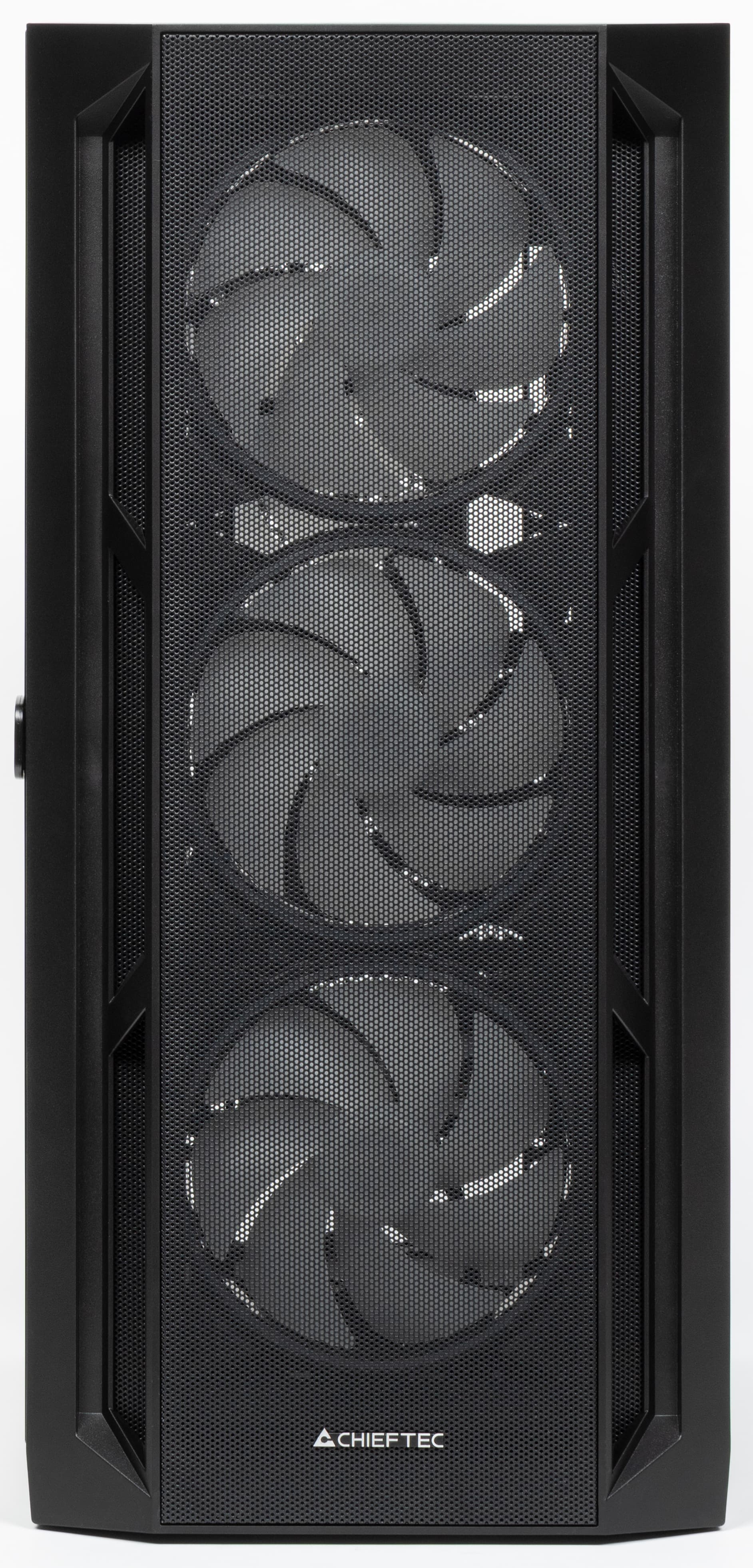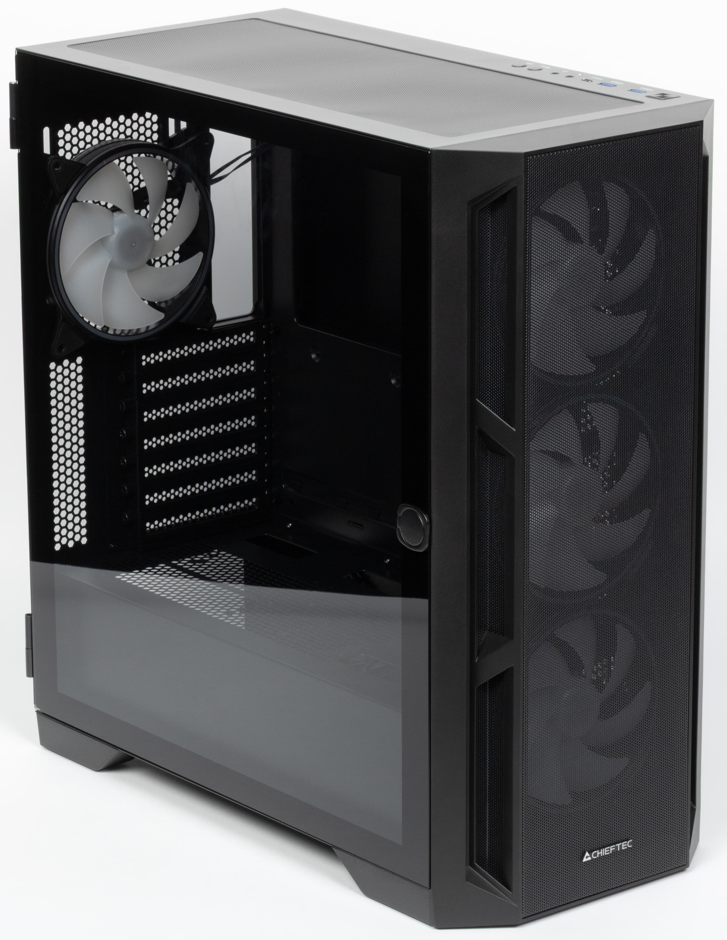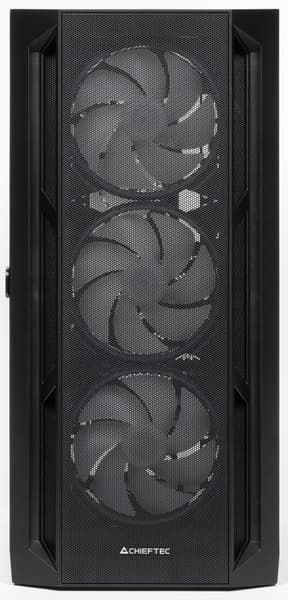 У этого корпуса одна прозрачная стенка из слегка тонированного закаленного стекла — левая боковая, хотя тенденцией уже стало наличие минимум двух (плюс фронтальная), а порой и трех (плюс верхняя) стеклянных поверхностей. Но подобные изыски всё же на любителя, и если пользователям «старой школы» даже одно стекло покажется излишеством, подскажем: Chieftec предлагает немало корпусов разных размеров с непрозрачными поверхностями со всех сторон. Однако имеется и вариант Chieftec Apex с индексом GA-01B-TG-OP: у него, помимо цельностеклянной боковой, еще и фронтальная накладка оснащена стеклянная вставкой — это не модный ныне панорамный дизайн, в котором стеклянные панели стыкуются непосредственно, без промежуточных элементов, но приближение к нему.