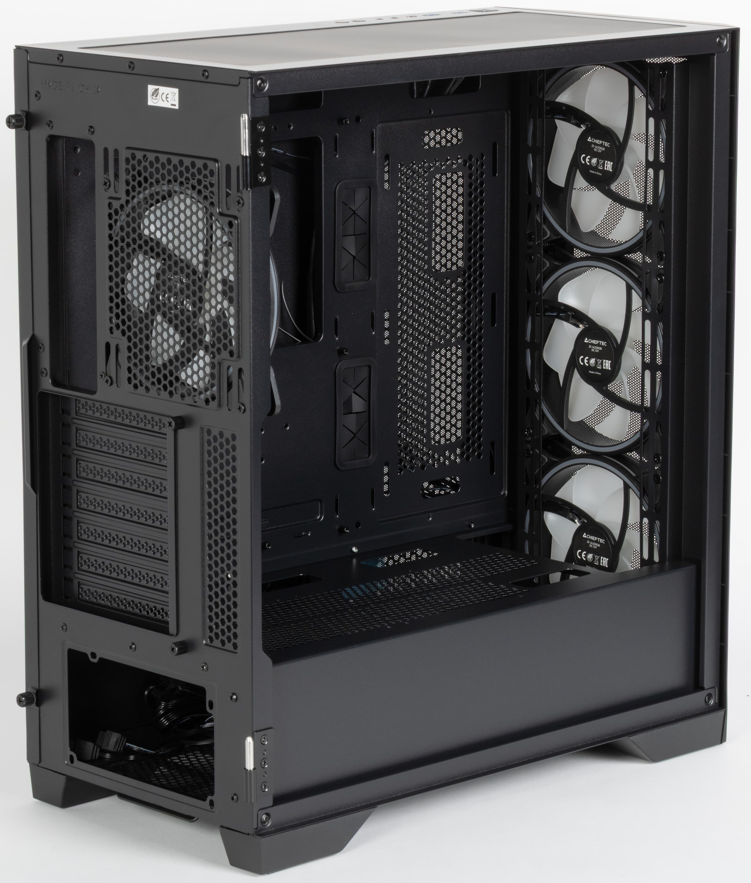 В верхнем объеме вертикально размещается системная плата форматом до Е-ATX включительно с платами расширения, за ее основанием имеются места для установки HDD/SSD. Правда, установка модных ныне плат с обратным расположением разъемов (Back Connect) не поддерживается.