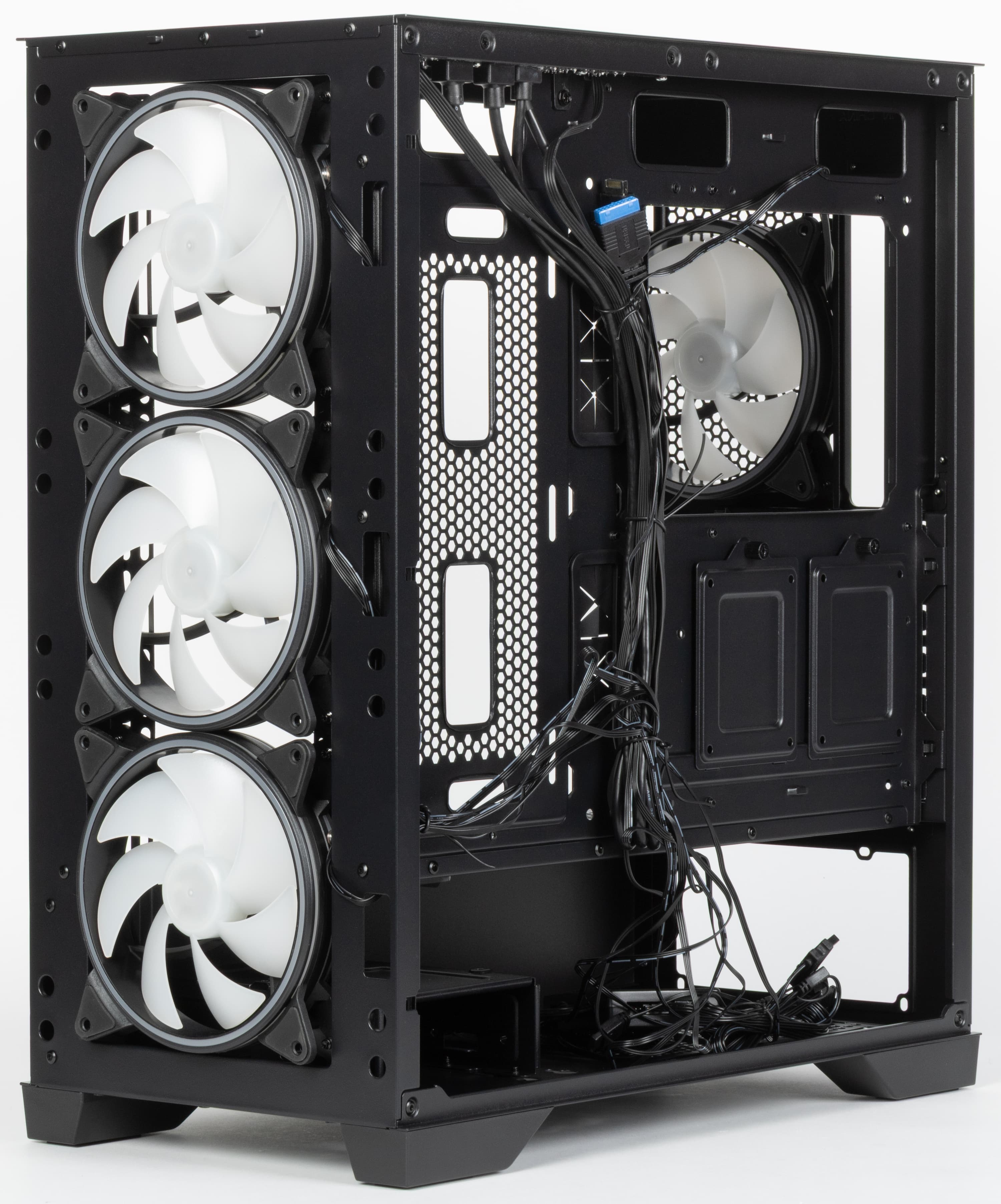 Никаких декоративных панелей или иных средств, позволяющих скрыть подходящие к системной плате провода и кабели от взгляда через стеклянную поверхность, не предусмотрено, и тут сборщику придется проявить фантазию, чтобы сделать всё красиво.