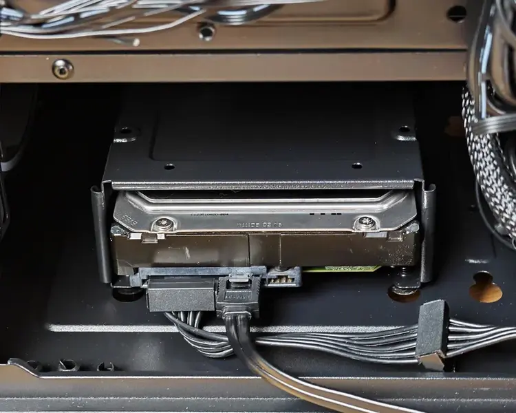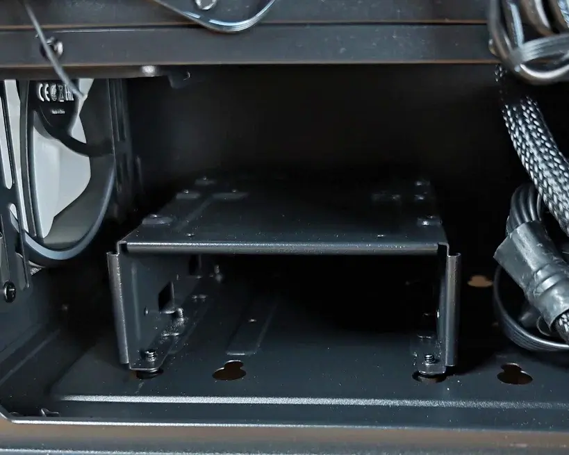 Кроме того, в передней части нижнего отсека корпуса имеется П-образная дисковая корзина, внутрь которой можно установить один 3,5-дюймовый жесткий диск, а на верхнюю ее поверхность — еще один HDD или SSD любого из двух размеров, закрепляя их винтами.