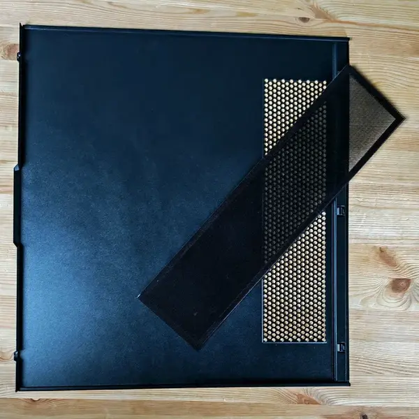 Верхний и правый боковой фильтры — листы гибкого пластика с мелкими круглыми отверстиями. С помощью закрепленных по периметру магнитных полос они крепятся к металлу соответствующих панелей корпуса. Верхний фильтр расположен снаружи, обслуживать его проще всего, а боковой изнутри — придется снимать правую стенку (об этом ниже).