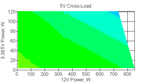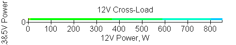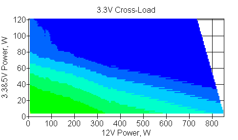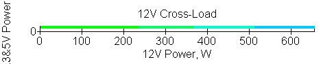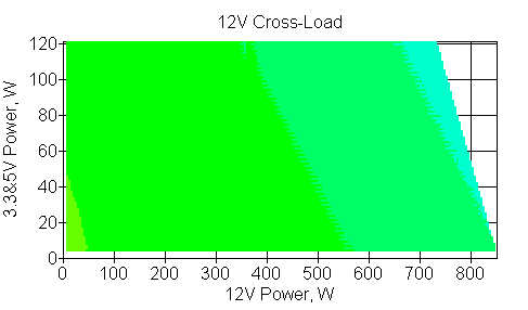 Следующим этапом инструментального тестирования является построение кросснагрузочной характеристики (КНХ) и представление ее на четвертьплоскости, ограниченной максимальной мощностью по шине 3,3&5 В с одной стороны (по оси ординат) и максимальной мощностью по шине 12 В с другой (по оси абсцисс). В каждой точке измеренное значение напряжения обозначается цветовым маркером в зависимости от отклонения от номинального значения.