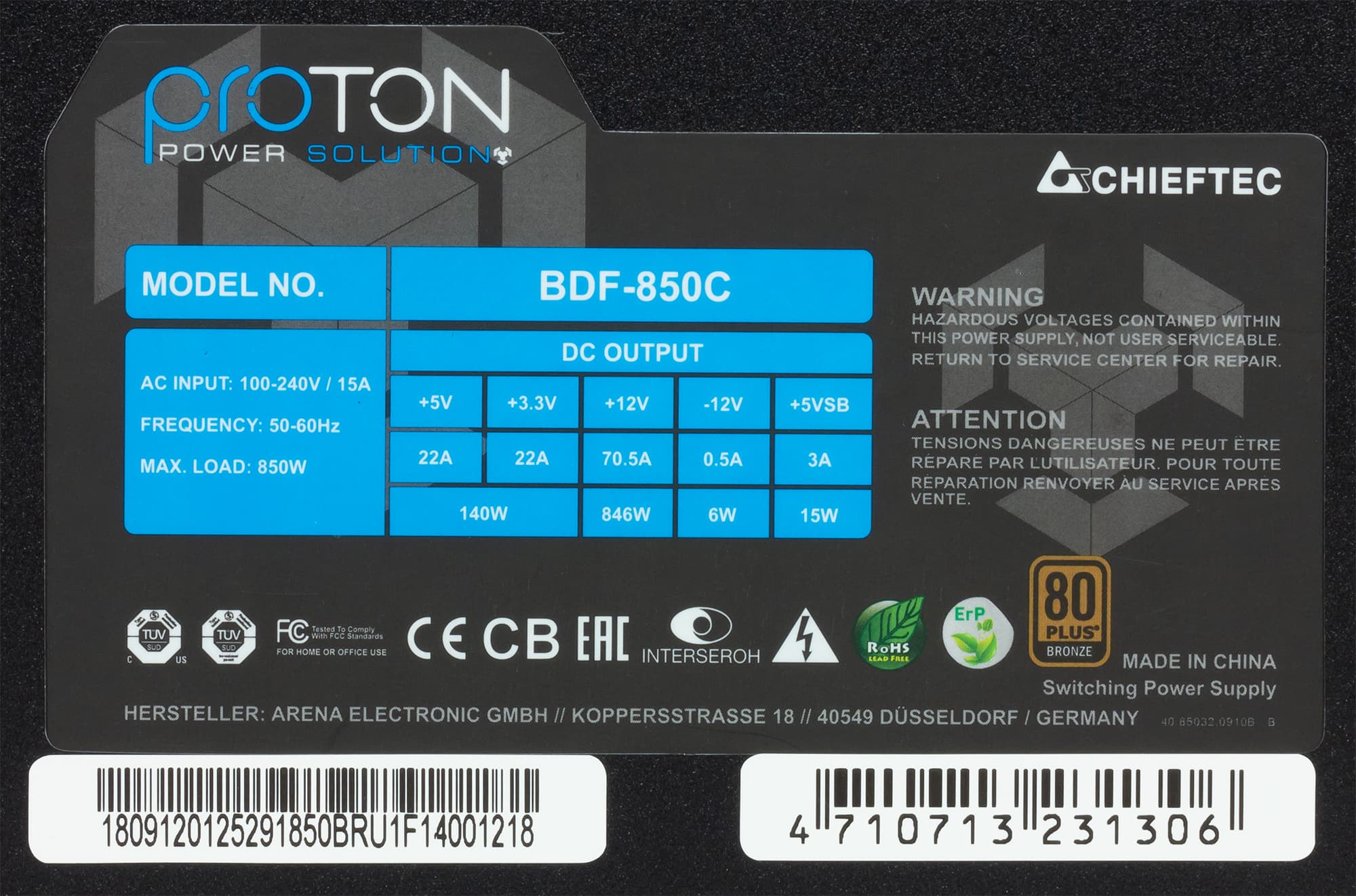 Блок питания Chieftec BDF-850C относится к серии Proton, анонсированной в середине 2017 года. Название серии абсолютно новое, ранее оно компанией не использовалось. К Proton относятся семь моделей мощностью от 400 до 1000 Вт, т. е. охватывается почти весь разумный диапазон. Если посмотреть на внешний вид представленных моделей, то сразу можно выделить две группы: блоки питания мощностью 400, 500, 600 Вт и 650, 750, 850, 1000 Вт. Таким образом, перед нами серия, модели которой выполнены как минимум на двух разных платформах, что у компании Chieftec встречается довольно регулярно. И при выборе надо понимать, что у БП BDF-600S и BDF-650C разница заключается далеко не только в выходной мощности, хотя серия, к которой относятся обе модели, одна и та же.