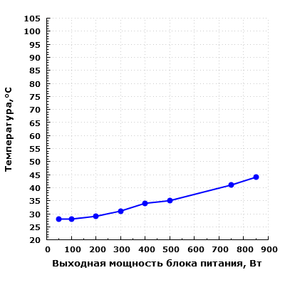 При нагрузке в 750 Вт шум блока питания уже превышает значение в 40 дБА при условии настольного размещения, то есть при расположении блока питания в ближнем поле по отношению к пользователю. Подобный уровень шума можно охарактеризовать как достаточно высокий.