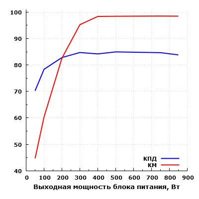 Эффективность БП находится на относительно невысоком уровне. Согласно нашим измерениям, КПД данного блока питания достигает значения свыше 84% в диапазоне мощности от 300 до 750 ватт, максимальное зарегистрированное значение составило около 85% на мощности 500 Вт. КПД на мощности 50 Вт составил около 70%.