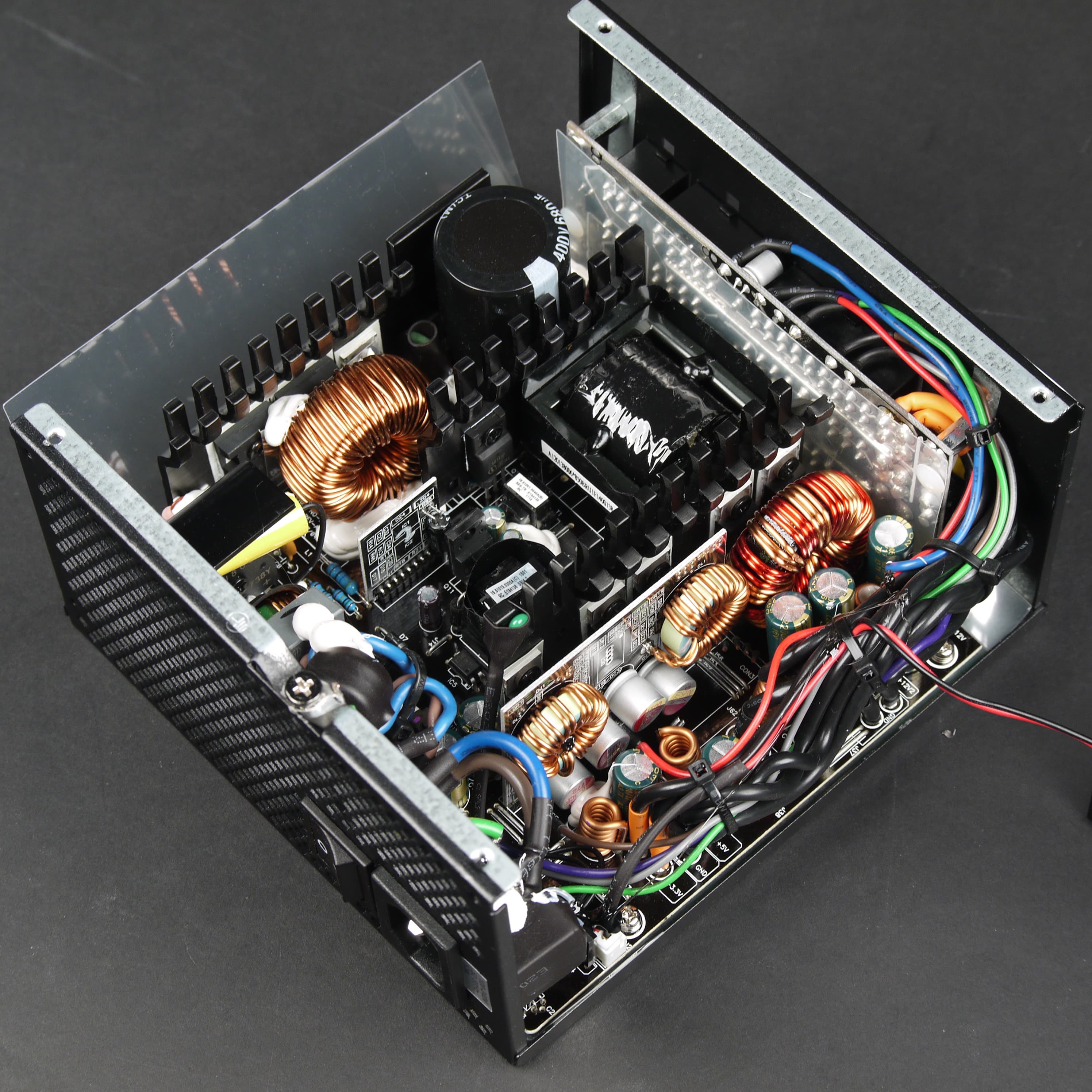 Основные полупроводниковые элементы установлены на трех компактных радиаторах с небольшим оребрением. Независимые источники +3.3VDC и 5VDC установлены на дочерней печатной плате и, по традиции, дополнительных теплоотводов не имеют — это вполне типично для блоков питания с активным охлаждением. В блоке питания установлены конденсаторы преимущественно под маркой Teapo, а также некоторое количество полимерных конденсаторов — в основном на плате DC/DC-преобразователя.