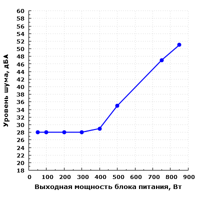 Шум блока питания находится на сравнительно низком уровне (ниже среднетипичного) при работе в диапазоне мощности до 400 Вт включительно. Такой шум будет малозаметен на фоне типичного фонового шума в помещении в дневное время суток, особенно при эксплуатации данного блока питания в системах, не имеющих какой-либо звукошумовой оптимизации. Уровень шума не является очень низким даже при минимальной нагрузке, но в типичных бытовых условиях большинство пользователей оценивает устройства с подобной акустической эргономикой как относительно тихие.