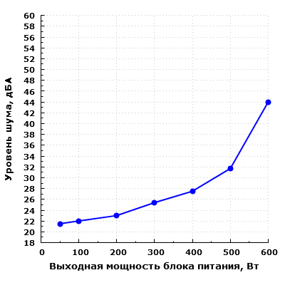 При дальнейшем увеличении выходной мощности уровень шума блока питания заметно повышается и при работе на максимальной мощности превышает значение в 40 дБА при условии настольного размещения, то есть при расположении блока питания в ближнем поле по отношению к пользователю. Подобный уровень шума можно охарактеризовать как достаточно высокий.