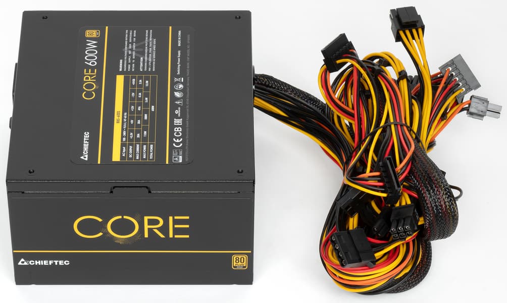 В этом году бюджетные продукты востребованы как никогда, поэтому мы решили уделять им больше внимания. В серии Core у компании Chieftec представлены три модели мощностью 500, 600 и 700 Вт, все они характеризуются наличием сертификата 80Plus Gold. Нам для тестирования был предоставлен блок питания Chieftec Core 600W (BBS-600S). Его розничная цена на момент подготовки обзора составляла около 5000 рублей.