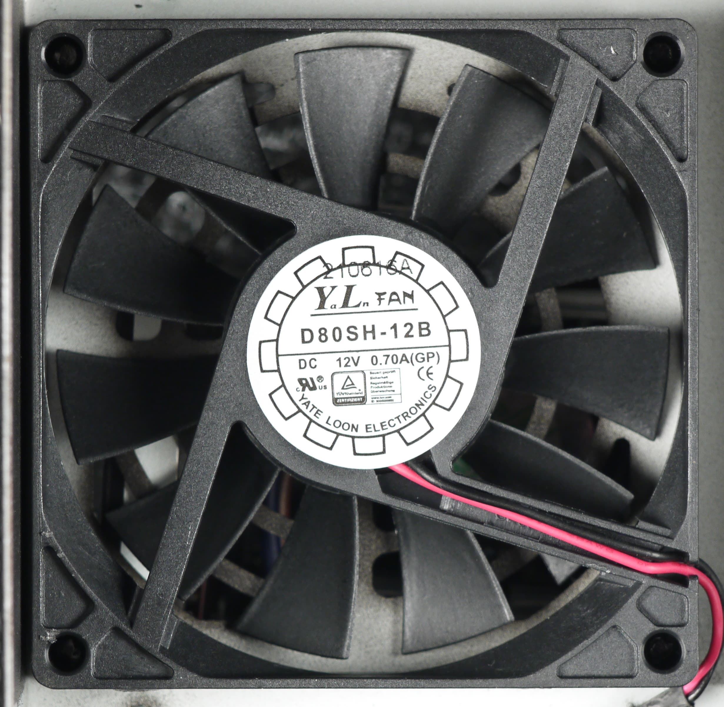 В блоке питания установлен низкопрофильный (высотой 15 мм) вентилятор Yateloon D80SH-12B типоразмера 80 мм, с частотой вращения 3000 об/мин. Подключение двухпроводное, через разъем. Вентилятор основан на подшипнике скольжения, что говорит о некоторой экономии на данном элементе. Чаще всего в блоках питания такого типа устанавливают вентиляторы на шарикоподшипниках или иных типах подшипников с высоким сроком службы. Но, безусловно, гарантийный срок и этот вентилятор должен отработать.