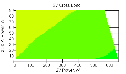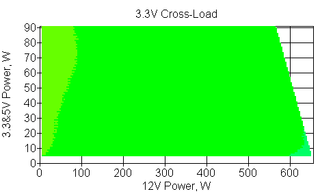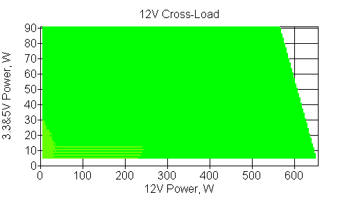 Следующим этапом инструментального тестирования является построение кросснагрузочной характеристики (КНХ) и представление ее на четвертьплоскости, ограниченной максимальной мощностью по шине 3,3&5 В с одной стороны (по оси ординат) и максимальной мощностью по шине 12 В с другой (по оси абсцисс). В каждой точке измеренное значение напряжения обозначается цветовым маркером в зависимости от отклонения от номинального значения.