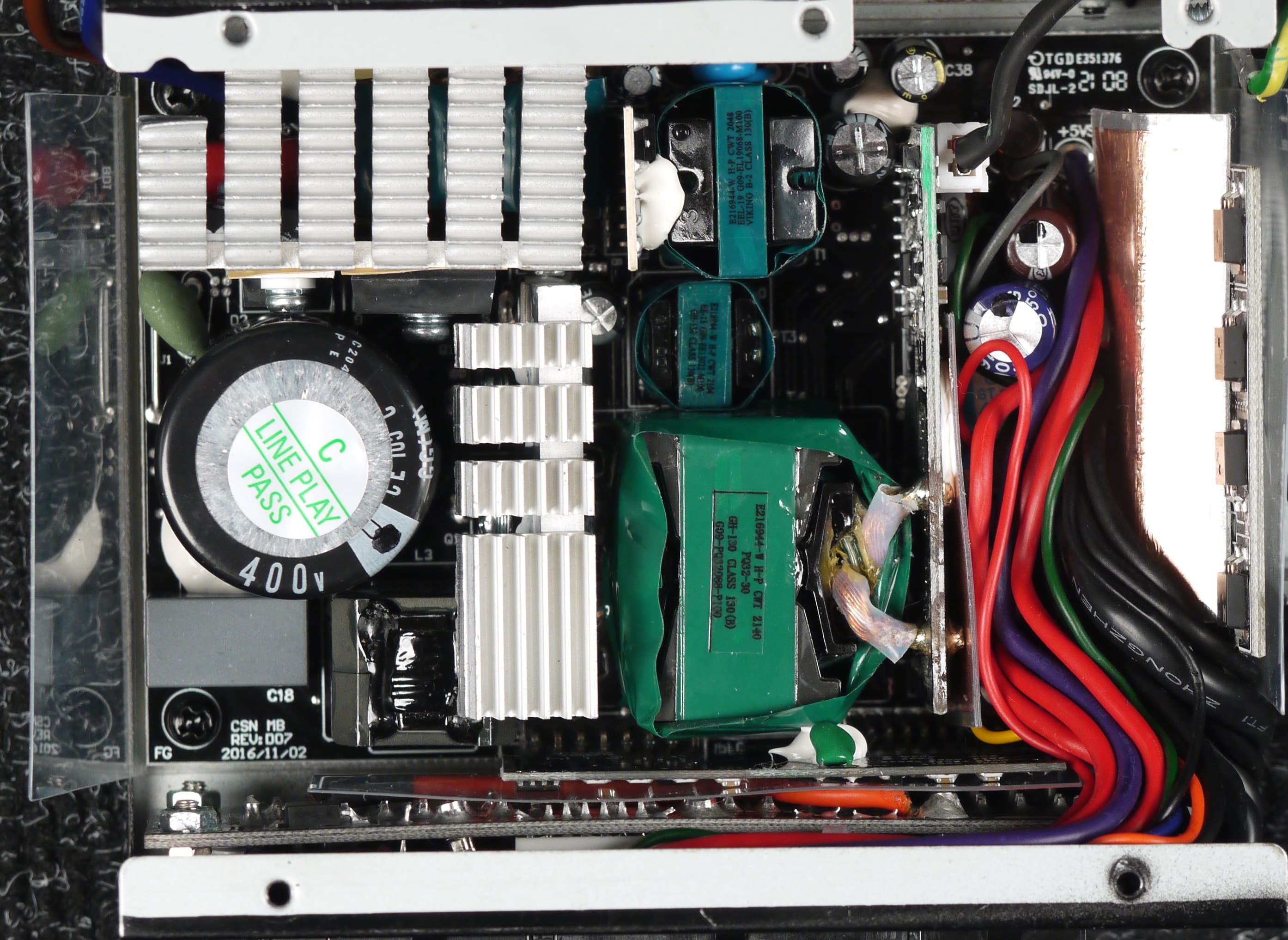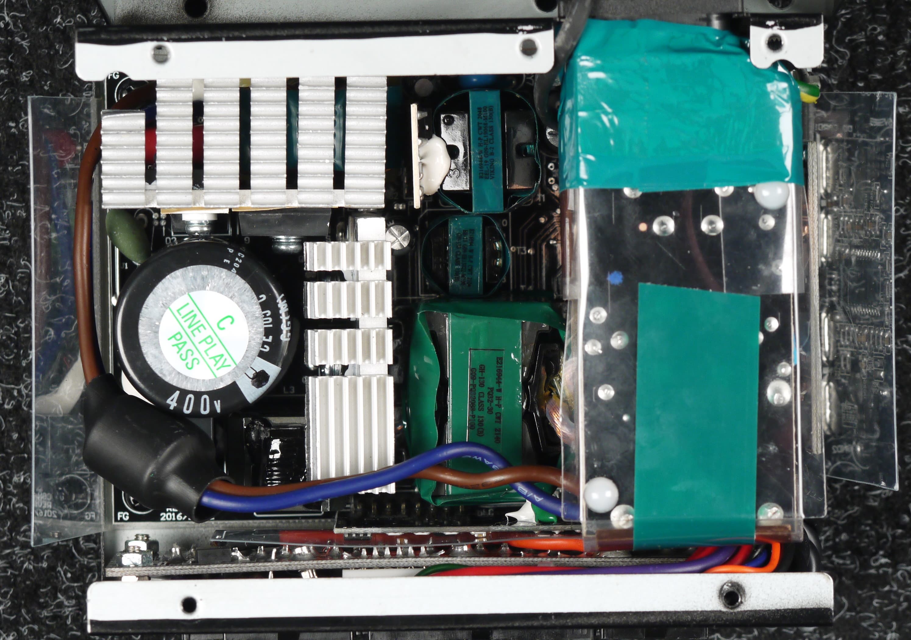 Высоковольтные силовые элементы установлены на двух радиаторах, элементы импульсных преобразователей каналов +3.3VDC и +5VDC размещены на дочерней печатной плате, установленной вертикально. Элементы синхронного выпрямителя также установлены на отдельной плате, расположенной около трансформатора вертикально.