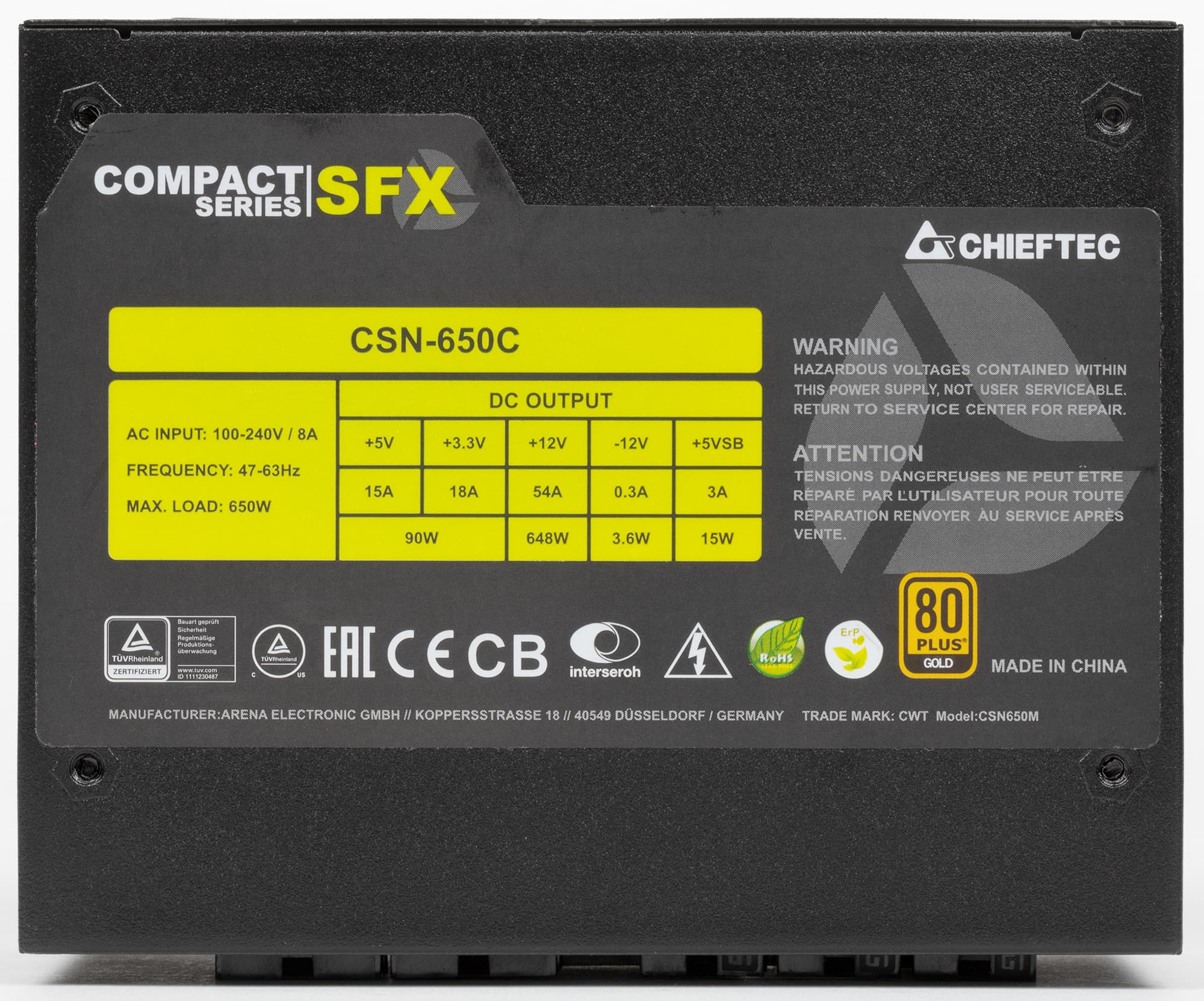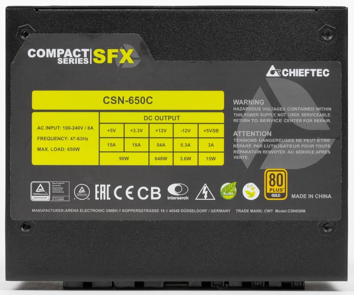 Блок питания Chieftec из серии Compact мощностью 650 Вт (CSN-650C) имеет сертификат 80+ Gold. Длина корпуса стандартная (для SFX-моделей): 100 мм. Но при выборе такого БП обязательно нужно учитывать, куда и как выходят провода для питания компонентов, чтобы их наличие и расположение не стали серьезным препятствием при установке в корпус. В комплекте поставки данной модели есть упомянутый переходник для установки на посадочное место формата ATX — стальная рамка с 8 отверстиями.