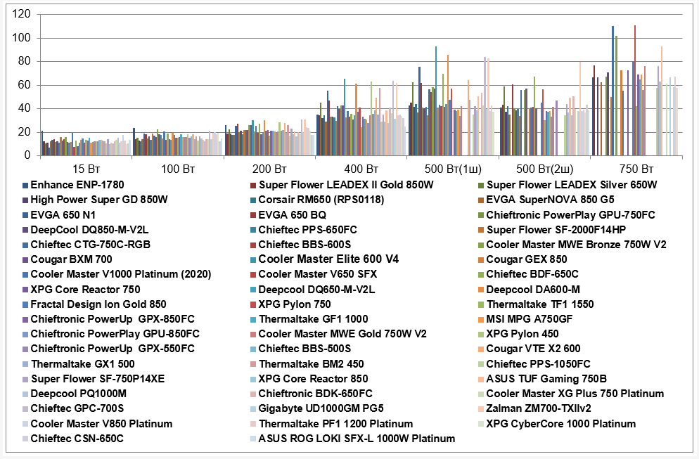 | Super Flower Leadex Silver 650W | 10,9 | 15,1 | 22,8 | 45,0 | 62,5 | 59,2 | |