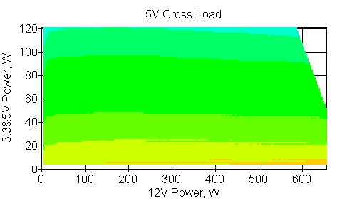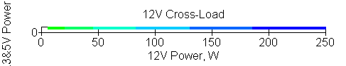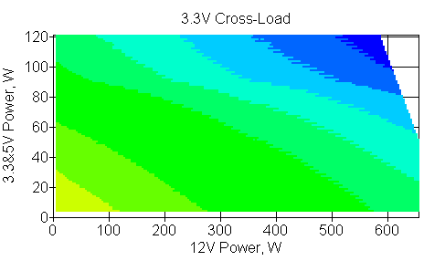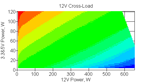 Следующим этапом инструментального тестирования является построение кросснагрузочной характеристики (КНХ) и представление ее на четвертьплоскости, ограниченной максимальной мощностью по шине 3,3&5 В с одной стороны (по оси ординат) и максимальной мощностью по шине 12 В с другой (по оси абсцисс). В каждой точке измеренное значение напряжения обозначается цветовым маркером в зависимости от отклонения от номинального значения.