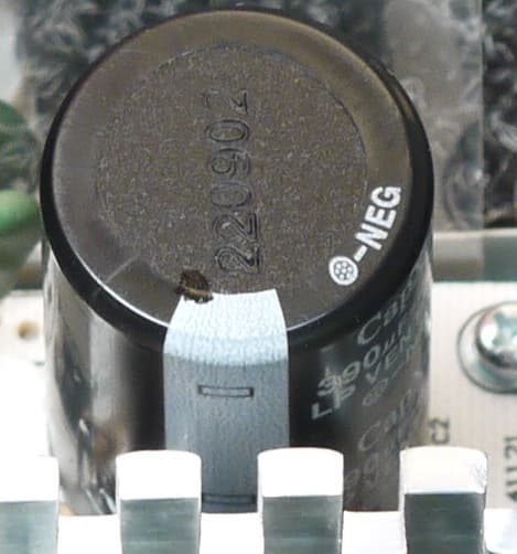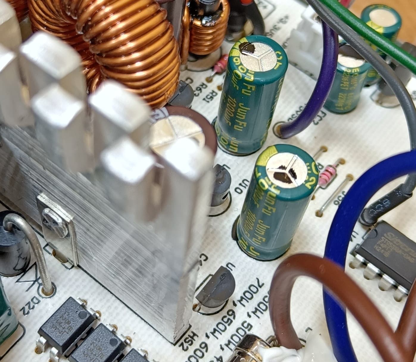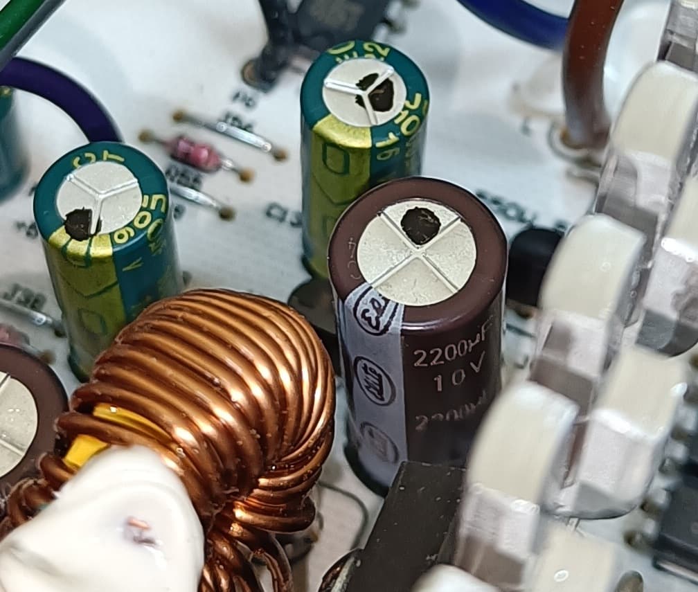 На входе установлена емкость под торговой маркой Capxon. В низковольтных цепях преобладают конденсаторы под торговыми марками Jun Fu и Elite.