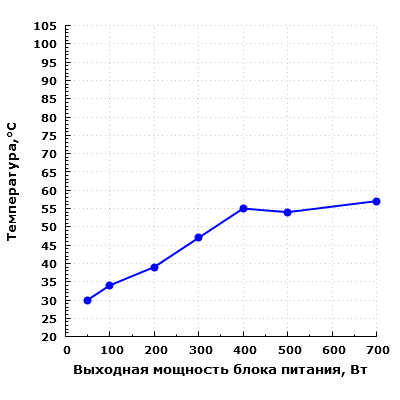 При нагрузке в 500 Вт шум блока питания уже превышает значение 40 дБА при условии настольного размещения, то есть при расположении блока питания в ближнем поле по отношению к пользователю. Подобный уровень шума можно охарактеризовать как достаточно высокий. При мощности 700 Вт шум достигает значения 55,5 дБА. Это очень высокий уровень шума, который доставляет сильный дискомфорт в домашних условиях.