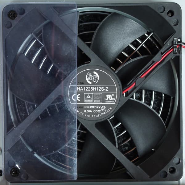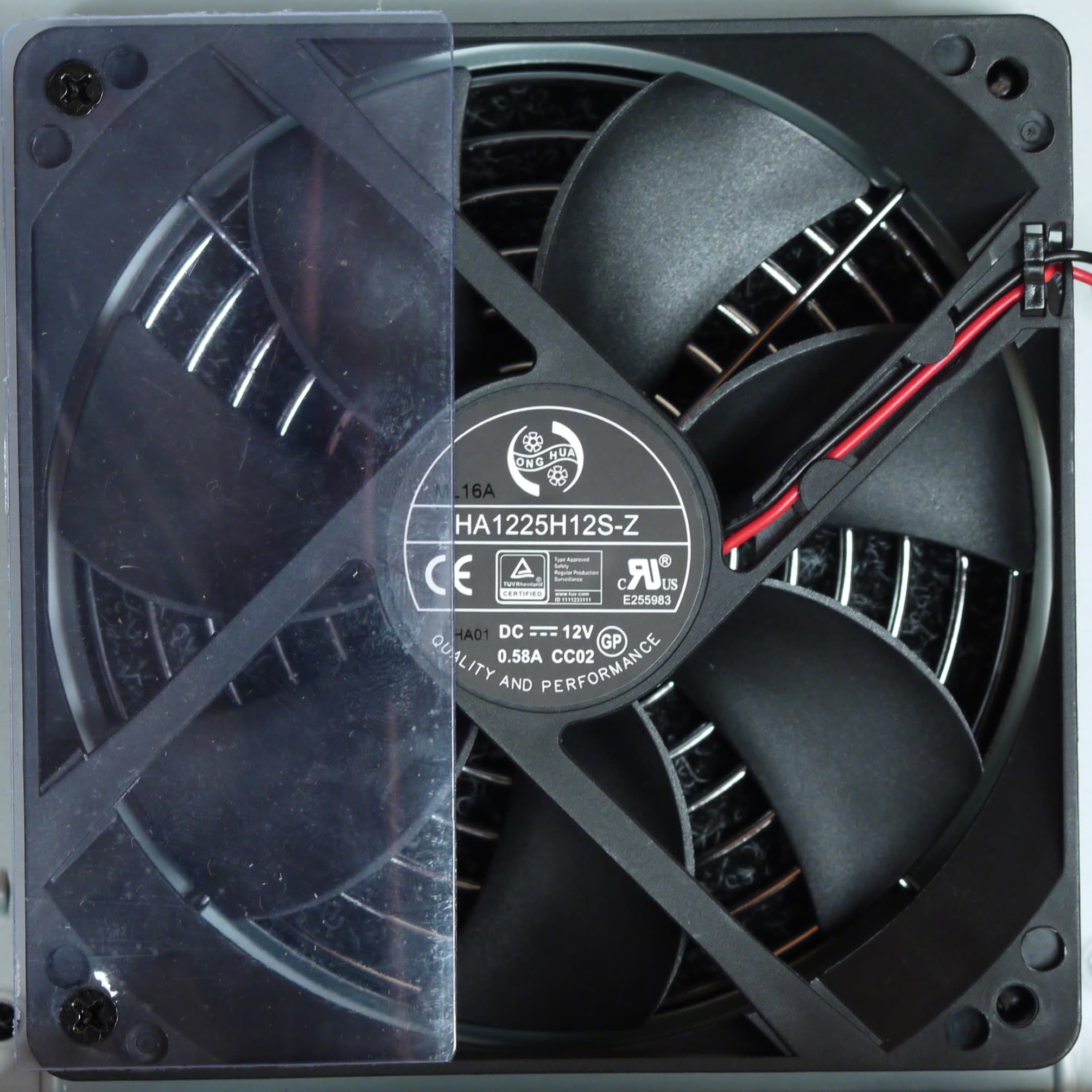 В блоке питания установлен вентилятор Hong Hua HA1225H12S-Z типоразмера 120 мм. Вентилятор выполнен на основе подшипника скольжения. Подключение двухпроводное, разъемное, так что поменять вентилятор будет несложно, а гарантийный срок он должен отработать без проблем.