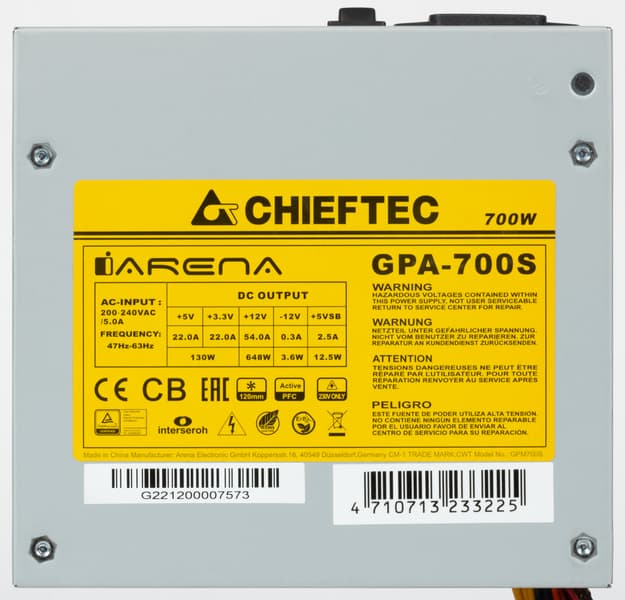 Мы продолжаем серию материалов, посвященных источникам питания с минимальной розничной стоимостью. На этот раз мы познакомимся с блоком питания Chieftec GPA-700S, который относится у производителя к серии iArena и является в ней старшей моделью (еще есть варианты на 550, 600 и 650 Вт). Данная модель поставляется без какой-либо упаковки, так как по большому счету она для розничной продажи не предназначена. Ее целевая аудитория — это сборщики и интеграторы, но так сложилось исторически, что в России подобные модели всегда продавались в рознице.