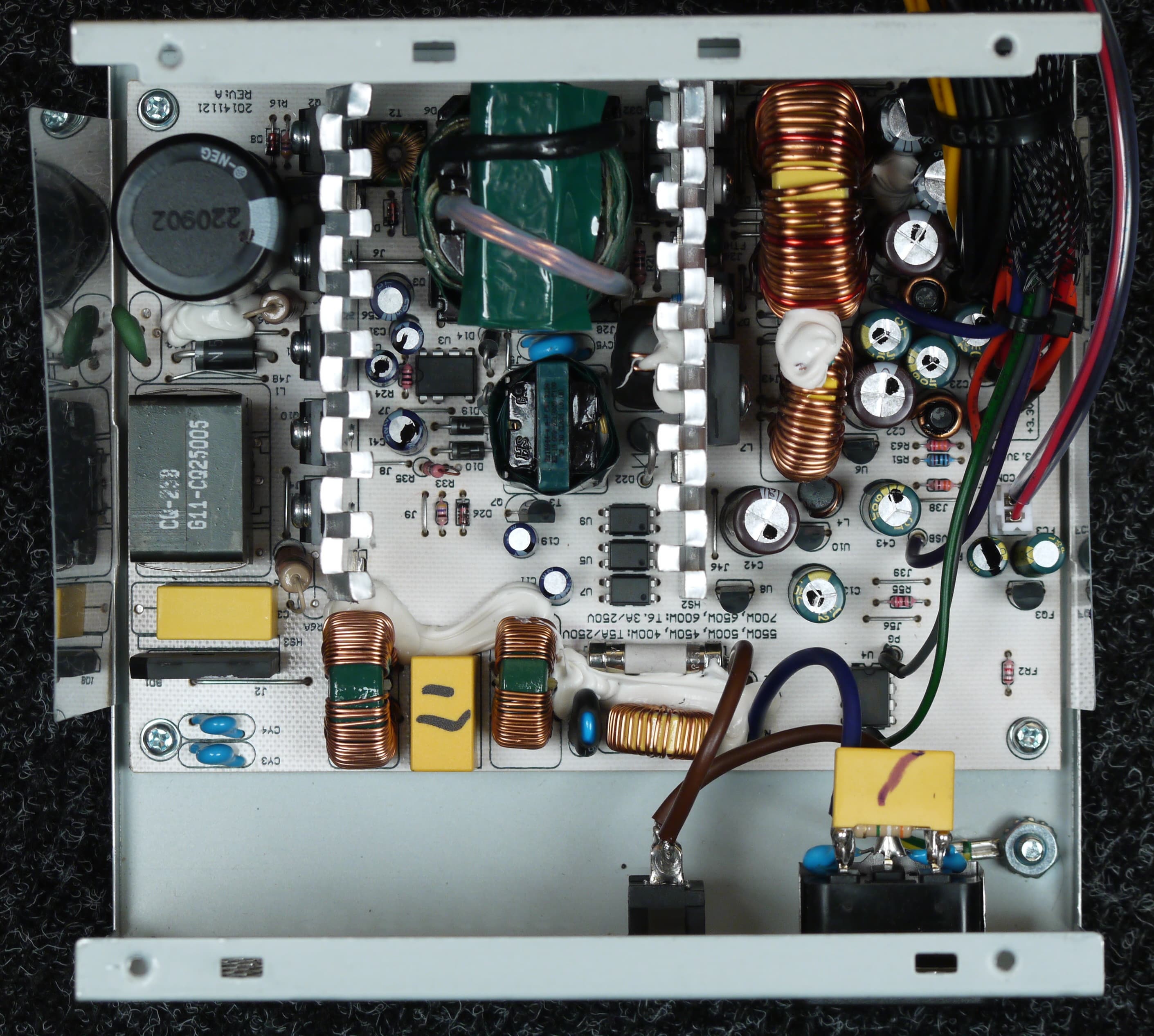 Выполнен блок питания на базе платформы CWT, и платформа явно не самая передовая: реализована групповая стабилизация каналов +5VDC и +12VDC, а также +3.3VDC на отдельном стабилизаторе на базе магнитного усилителя. Впрочем, это вполне типично для решений нижней части бюджетного сегмента.
