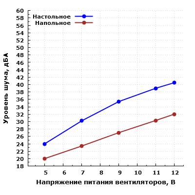 При большем удалении корпуса от пользователя и размещении его, к примеру, на полу под столом шум можно будет охарактеризовать как минимально заметный при питании вентиляторов от 5 В, а при питании от 12 В — как средний для жилого помещения в дневное время суток.