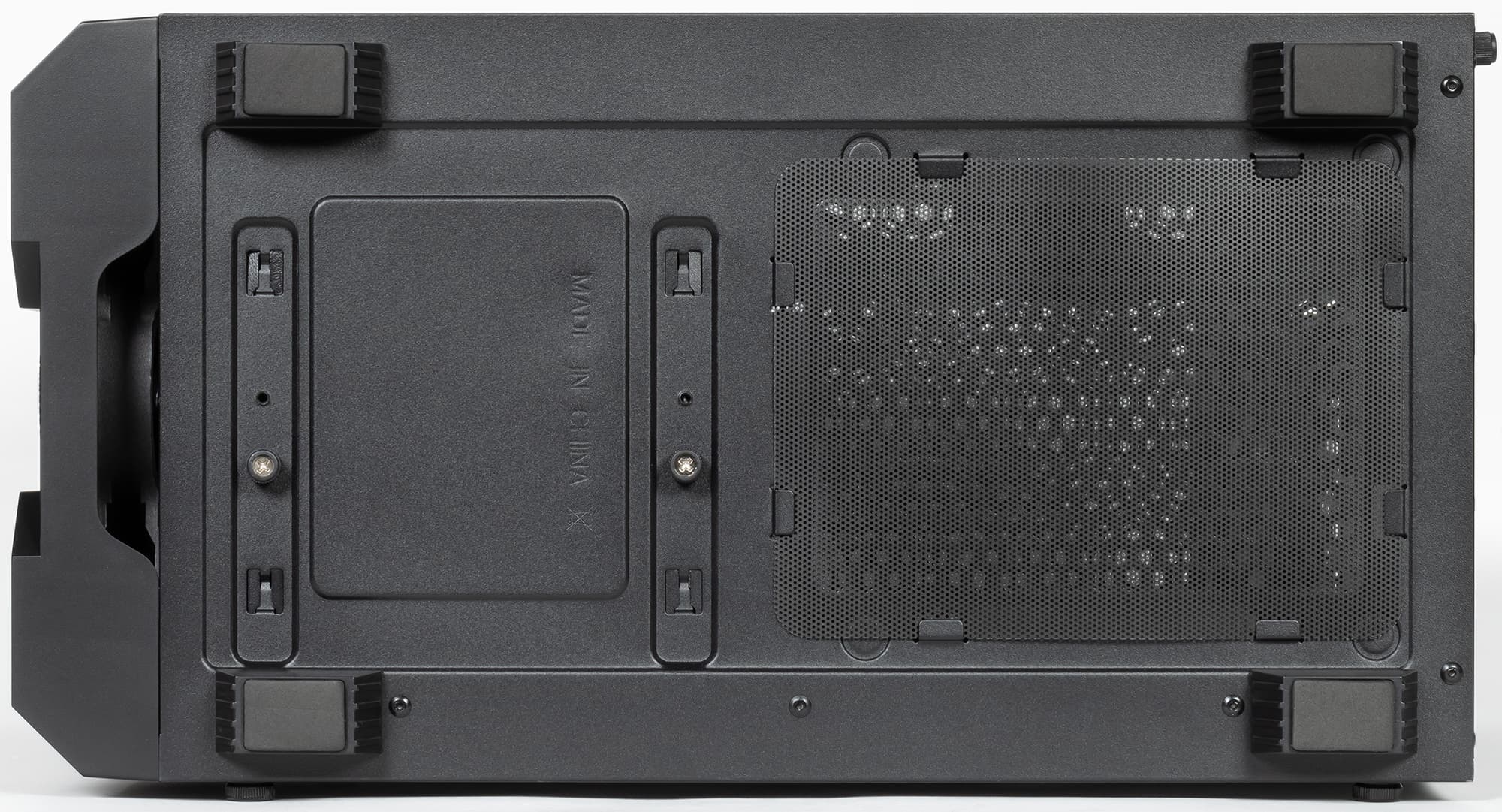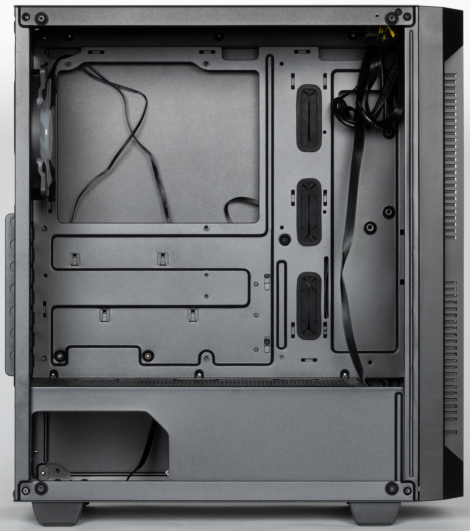 Правая стенка полностью стальная, сверху и снизу она имеет П-образную вальцовку. В ее передней части имеются зацепы, которые заходят в отверстия на шасси корпуса, образуя некое подобие петли. Фиксация стенки осуществляется двумя винтами с накатной головкой. Точнее, используются винты с напрессованной пластиковой накладкой — это такой бюджетный вариант исполнения винта с накатной головкой.
