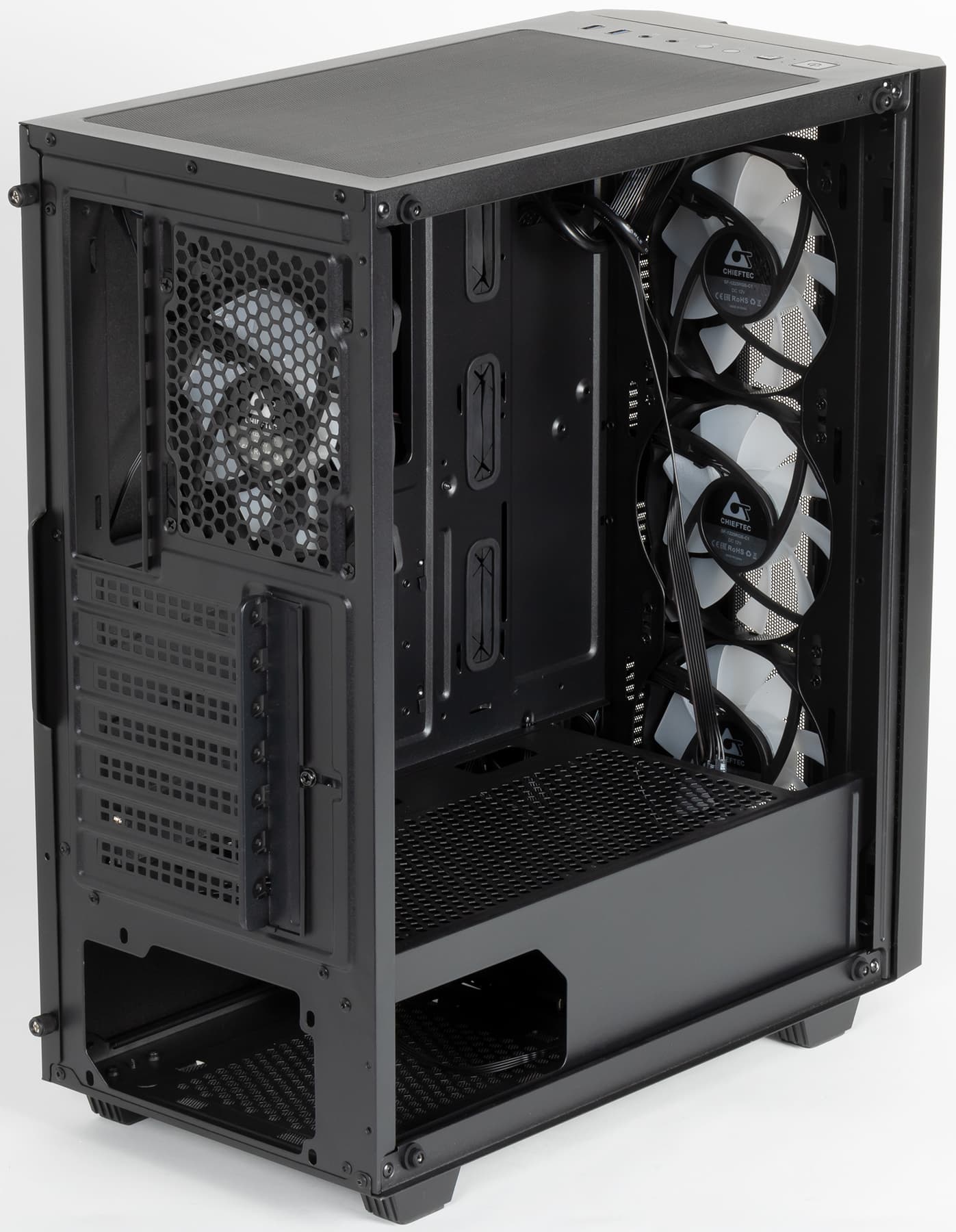 В корпусе предустановлено четыре вентилятора типоразмера 120 мм: три спереди и один сзади.
