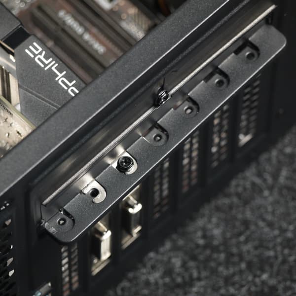 Крепление карт расширения осуществляется снаружи корпуса индивидуальными винтами, которые закрываются общей прижимной планкой, фиксируемой винтом под крестовую отвертку. Заглушки используются одноразовые, их нужно выламывать перед установкой карт расширения.