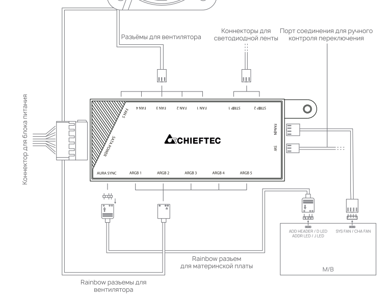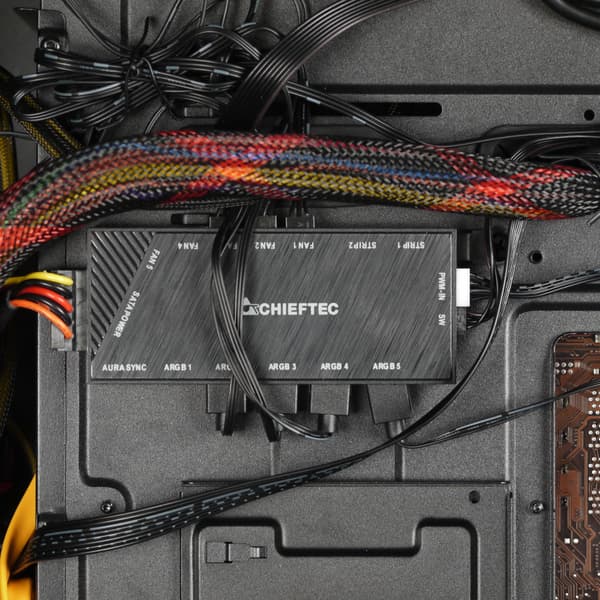 В корпусе реализована разветвленная система подсветки с управлением на базе штатного многофункционального контроллера Chieftec DF-501-V2, который позволяет управлять не только подсветкой, но и скоростью вращения вентиляторов. Всего к нему можно подключить 5 вентиляторов: 4 с трехконтактными разъемами (с управлением питающим напряжением) и один с ШИМ-управлением и четырехконтактным разъемом. Ожидаемо, первые 4 разъема заняты штатными вентиляторами корпуса, а к пятому можно подключить процессорный кулер, в разъем же кулера на плате можно подключить контроллер. Помимо пяти устройств с подсветкой типа +5V ARGB, контроллер позволяет подключить две светодиодные ленты с питанием +12V.