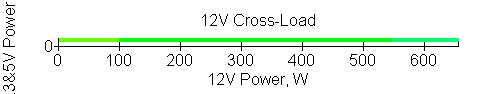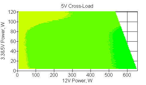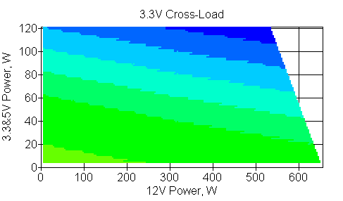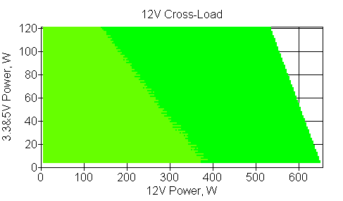 Следующим этапом инструментального тестирования является построение кросснагрузочной характеристики (КНХ) и представление ее на четвертьплоскости, ограниченной максимальной мощностью по шине 3,3&5 В с одной стороны (по оси ординат) и максимальной мощностью по шине 12 В с другой (по оси абсцисс). В каждой точке измеренное значение напряжения обозначается цветовым маркером в зависимости от отклонения от номинального значения.