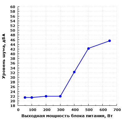 При работе на мощности до 300 Вт включительно шум блока питания находится на очень низком уровне — менее 23 дБА с расстояния 0,35 метра. Работающий вентилятор в данных режимах не ухудшит общую акустическую эргономику компьютера даже ночью.