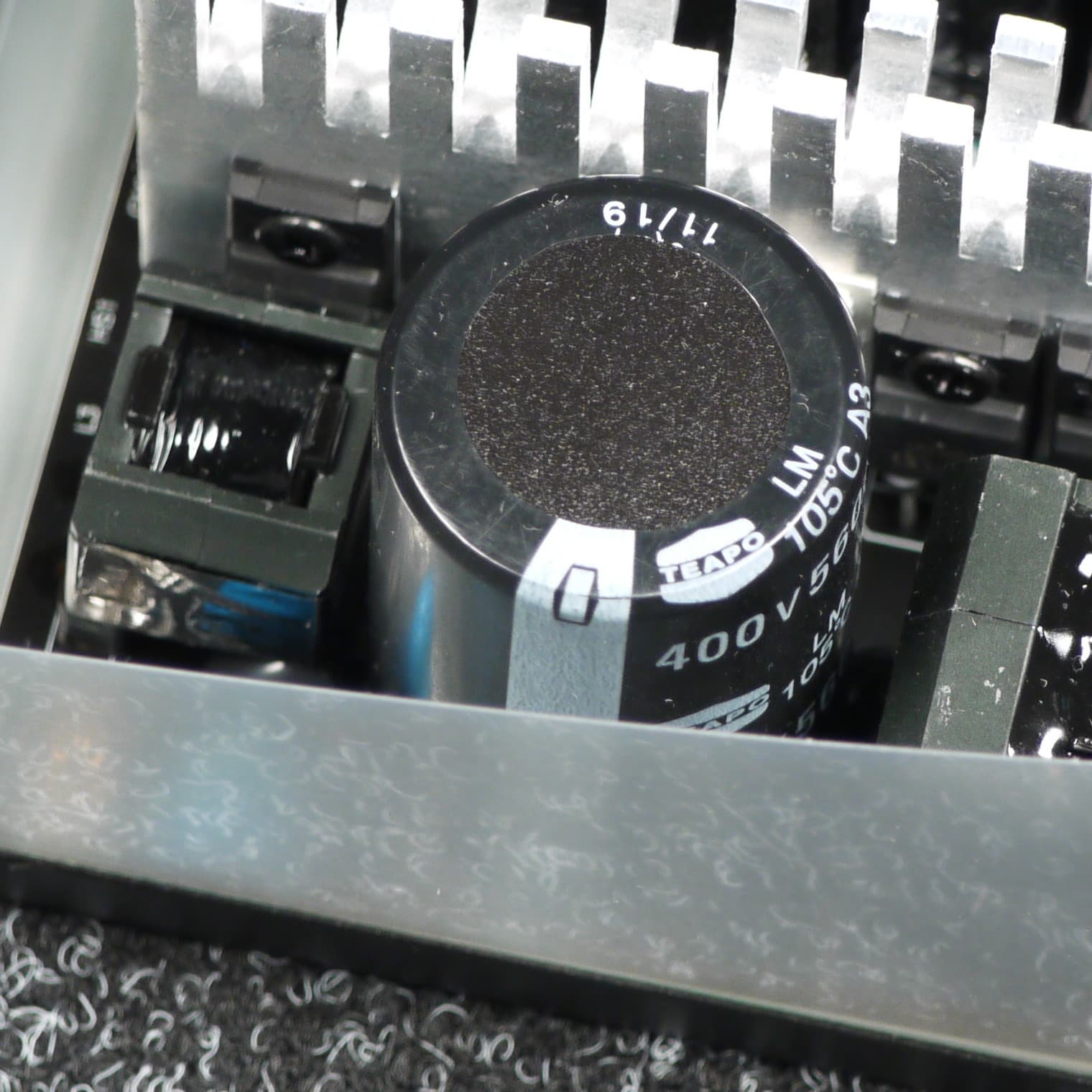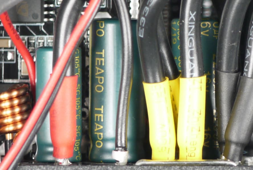 Конденсаторы в блоке питания представляют собой преимущественно продукцию под торговой маркой Teapo. Установлено и большое количество полимерных конденсаторов.