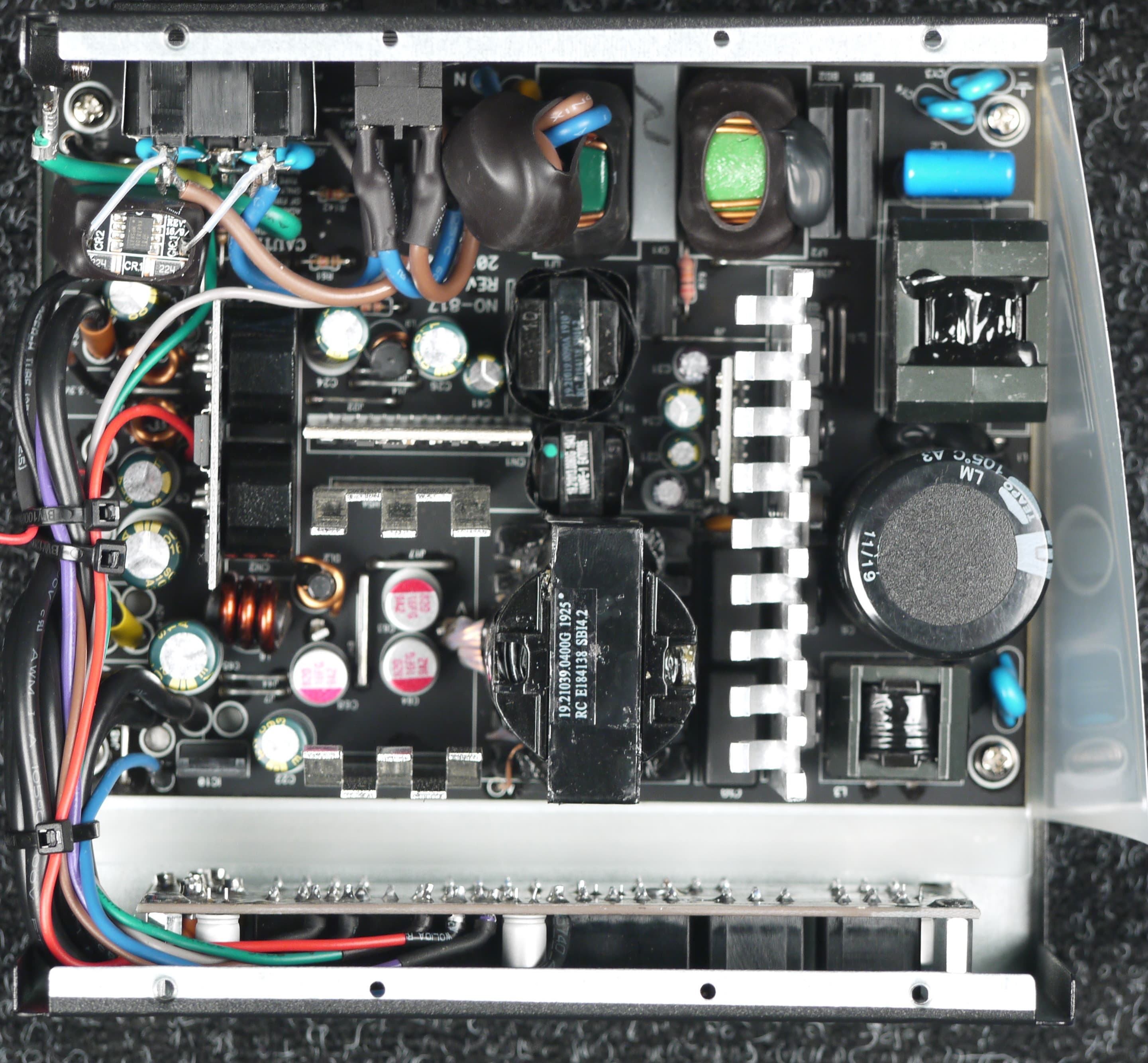 Конструкция блока питания вполне соответствует современным тенденциям: активный корректор коэффициента мощности, синхронный выпрямитель для канала +12VDC, независимые импульсные преобразователи постоянного тока для линий +3.3VDC и +5VDC.