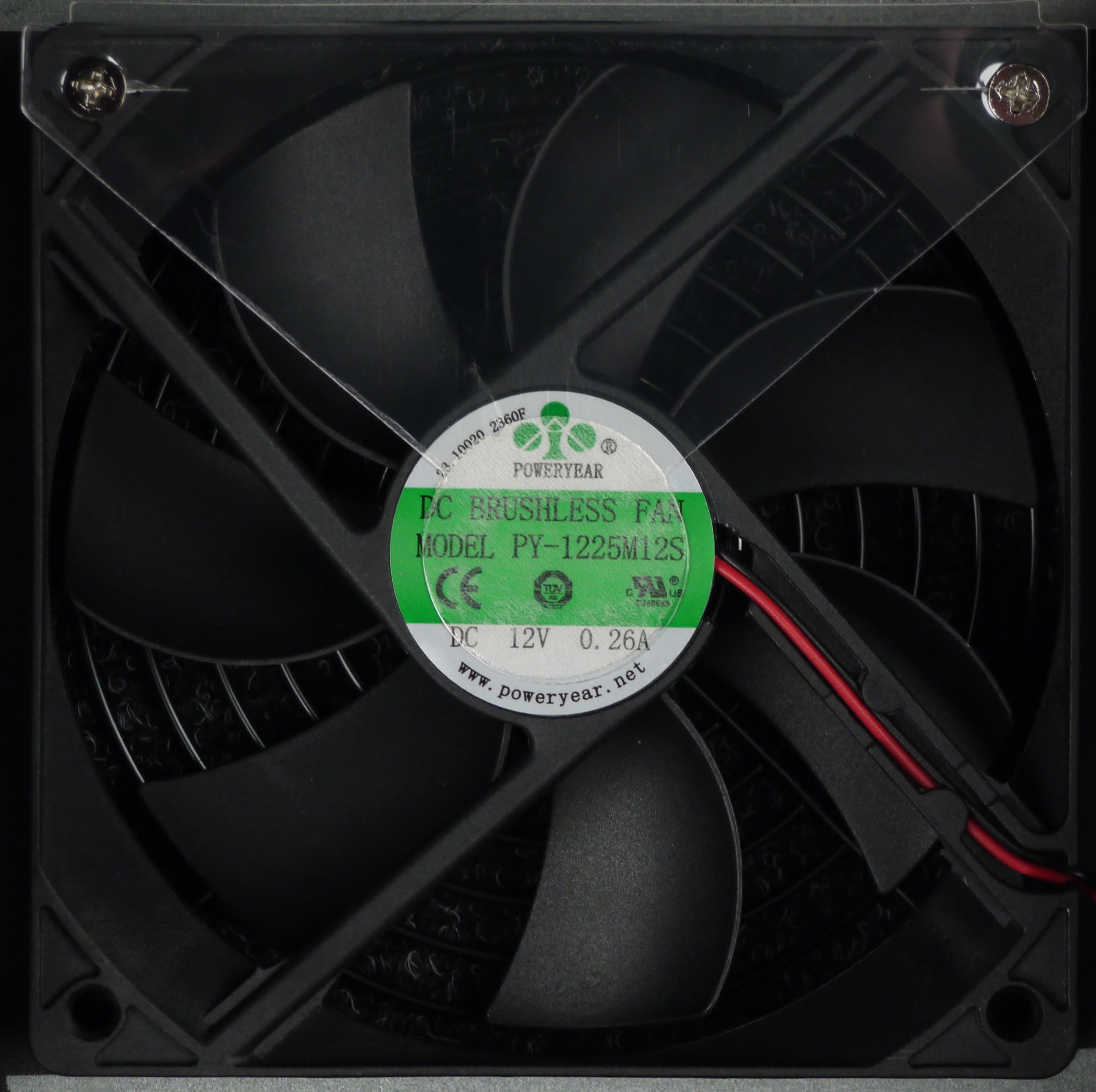 В блоке питания установлен вентилятор типоразмера 120 мм Poweryear PY-1225M12S, который, предположительно, имеет максимальную скорость вращения 2000 оборотов в минуту. Вентилятор выполнен на основе подшипника скольжения. Подключение двухпроводное, разъемное, так что поменять вентилятор будет несложно.