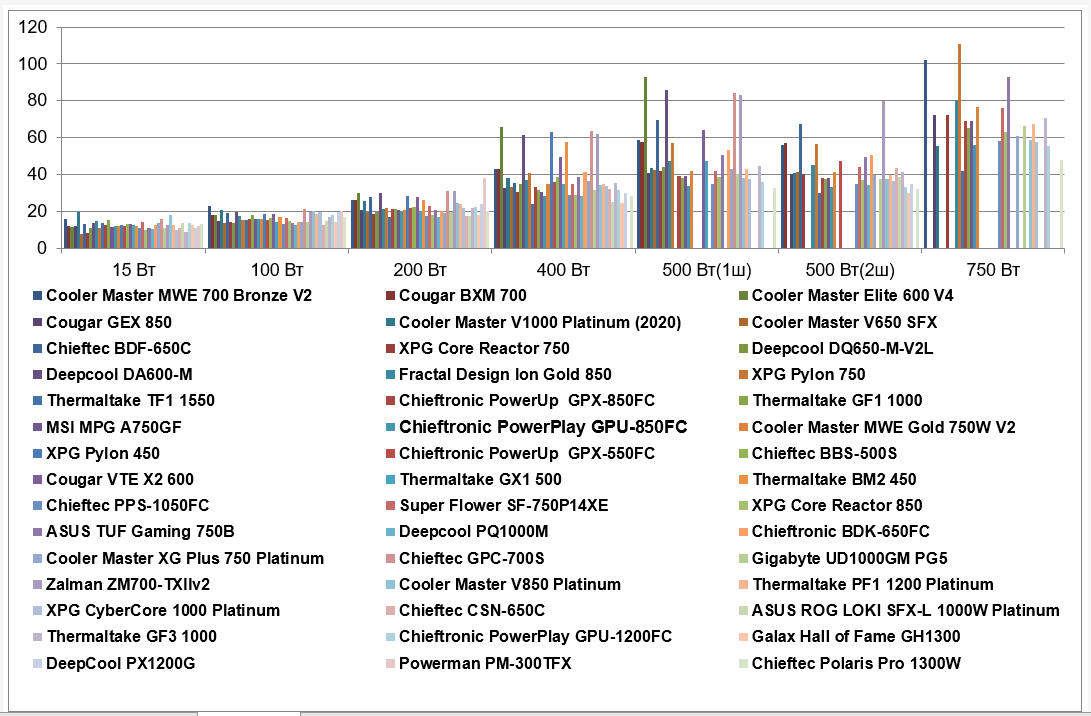 | Cooler Master V850 Platinum | 287 | 1052 | 1968 | 3806 | 4716 | 4711 | 7083 |